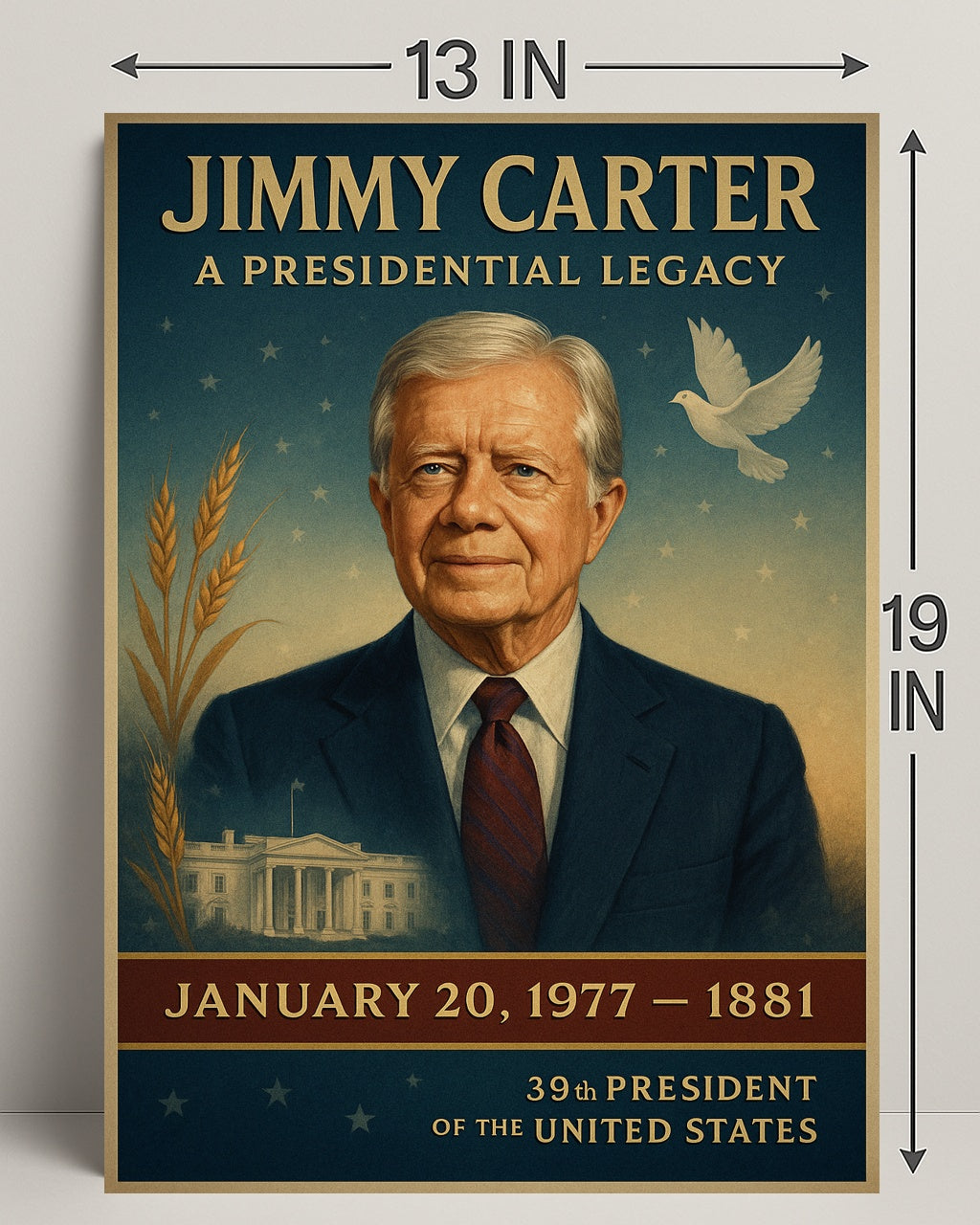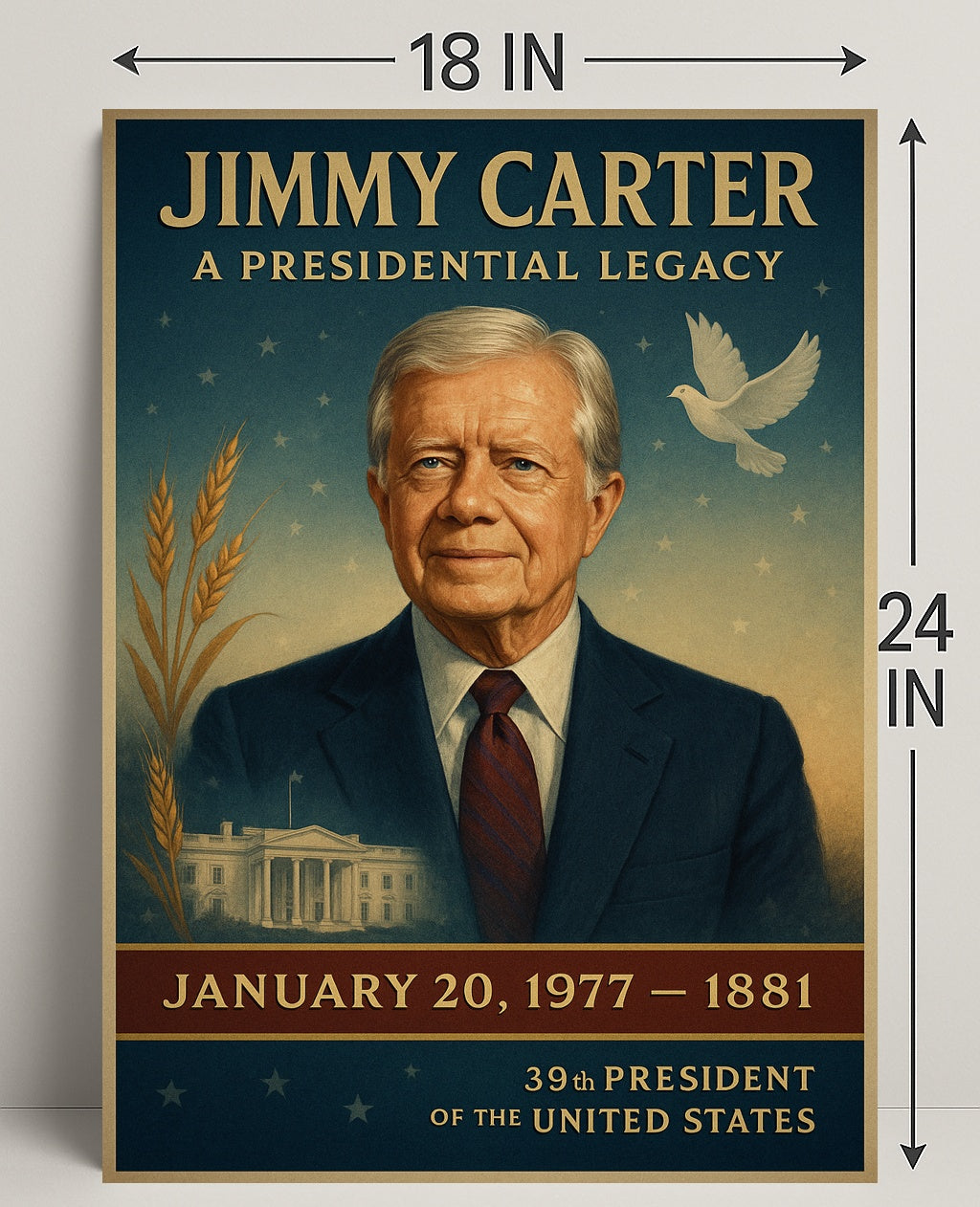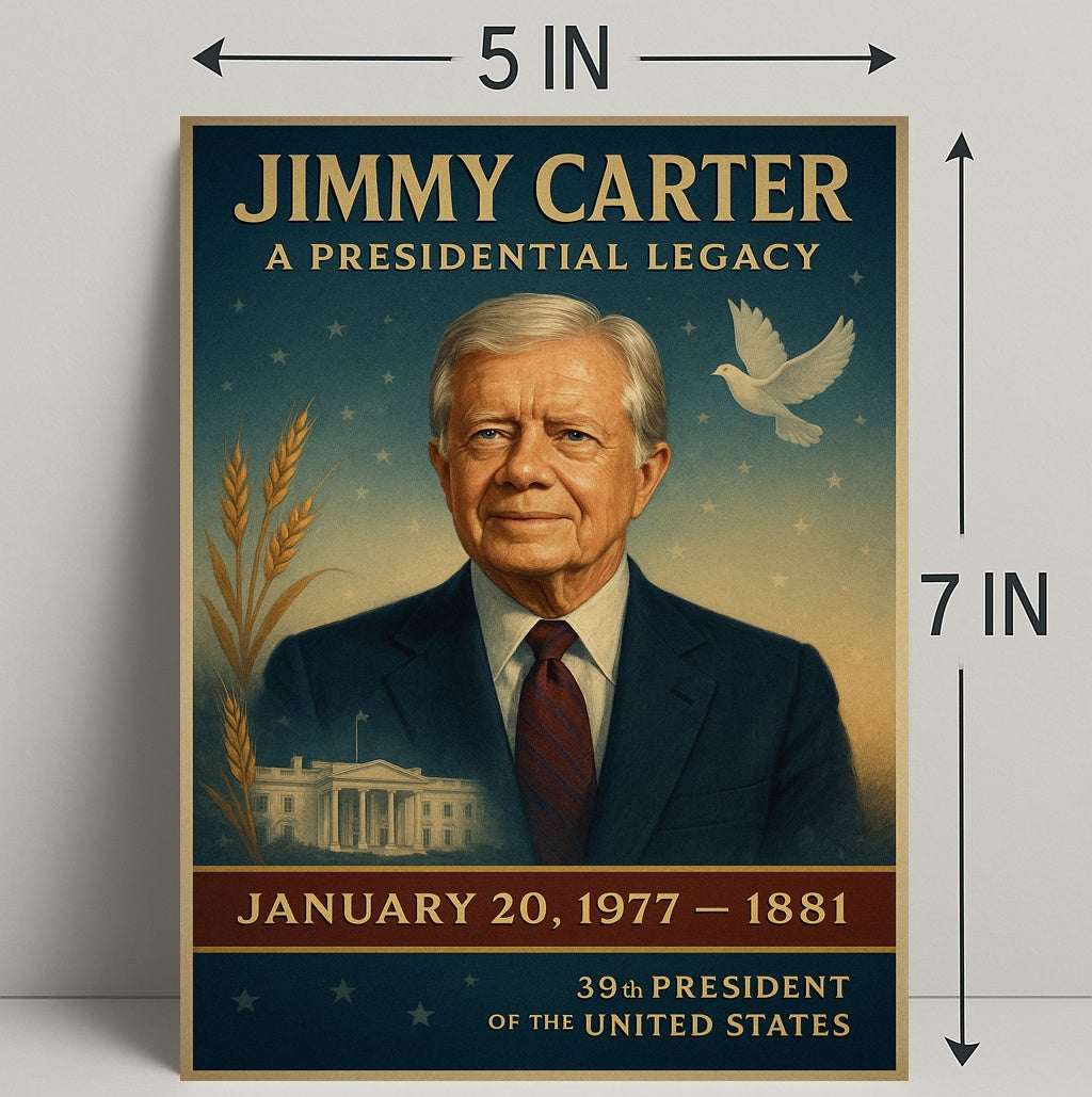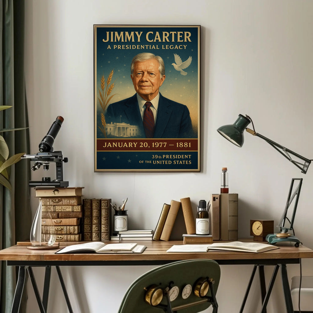 Honor a lasting chapter in American history with the Jimmy Carter Portrait Collection Gallery Print Poster from PosterGoat — a refined tribute to the 39th President rendered in elegant, vintage-inspired pop art. This gallery-style poster features a dignified portrait of Jimmy Carter set against a star-speckled sky, wheat motifs, a peaceful dove and a subtle White House vignette — all composed to evoke leadership, peace and rural roots. Perfect for home decor, offices, libraries or as a conversation-starting gift for history lovers and collectors of presidential art.