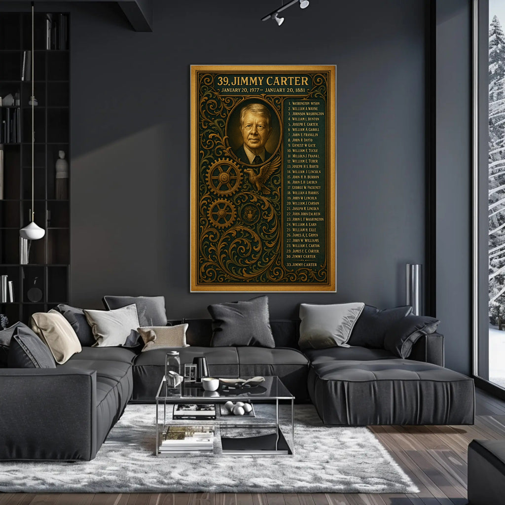 Celebrate a moment in American history with the Jimmy Carter 39th President Poster from PosterGoat. This museum-quality poster pairs a dignified portrait of President Carter with ornate, vintage-inspired filigree, engraved gears and an eagle motif for a timeless, collectible wall art piece that commands attention.