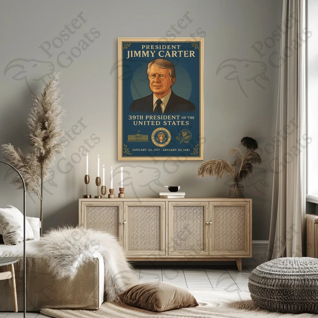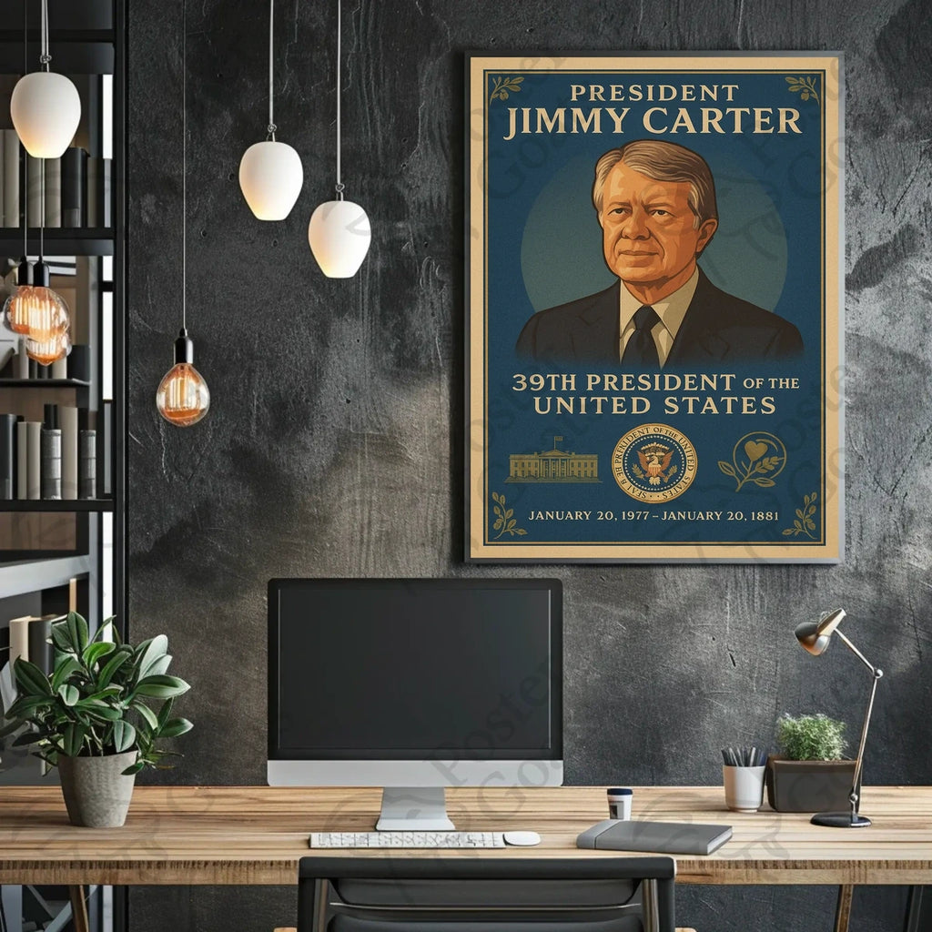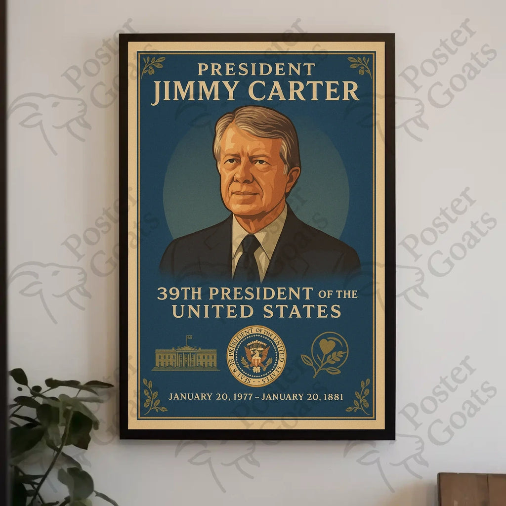 This stunning poster captures a vintage illustration of President Jimmy Carter, the 39th President of the United States, serving from 1977 to 1981. The elegant design features deep blues and neutral tones, creating a timeless and classic aesthetic. The central portrait depicts Carter in a formal suit, exuding confidence and leadership, set against a simple backdrop. Complementing the image are symbolic elements like the Presidential Seal, the White House, and decorative olive branches. Bold typography enhances the patriotic theme, making this piece perfect for history enthusiasts and collectors of presidential memorabilia.
