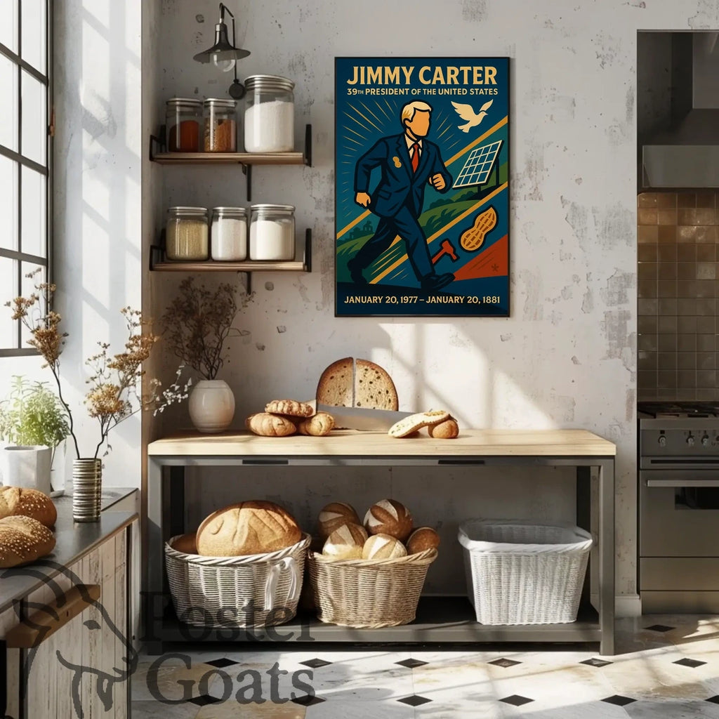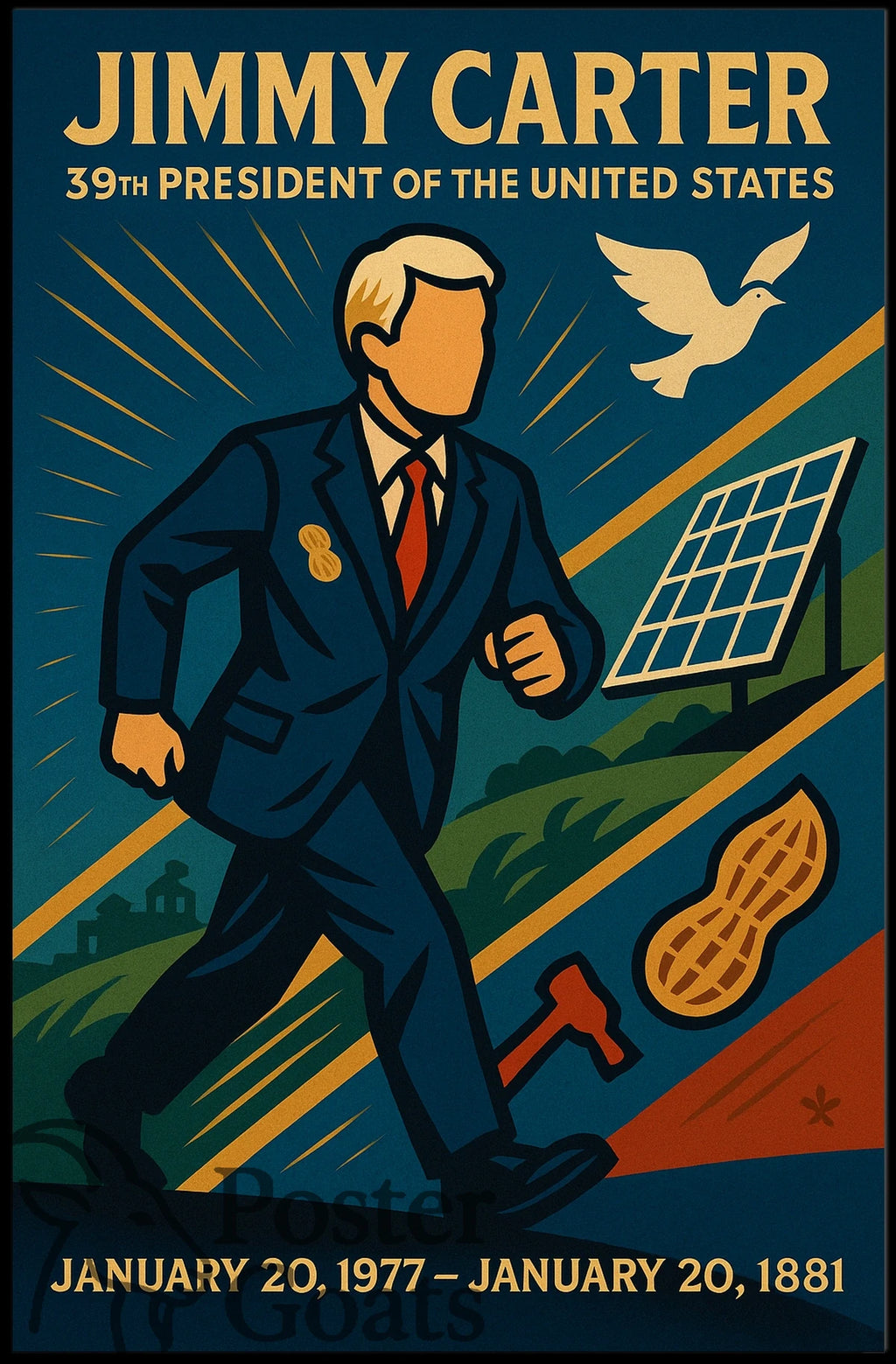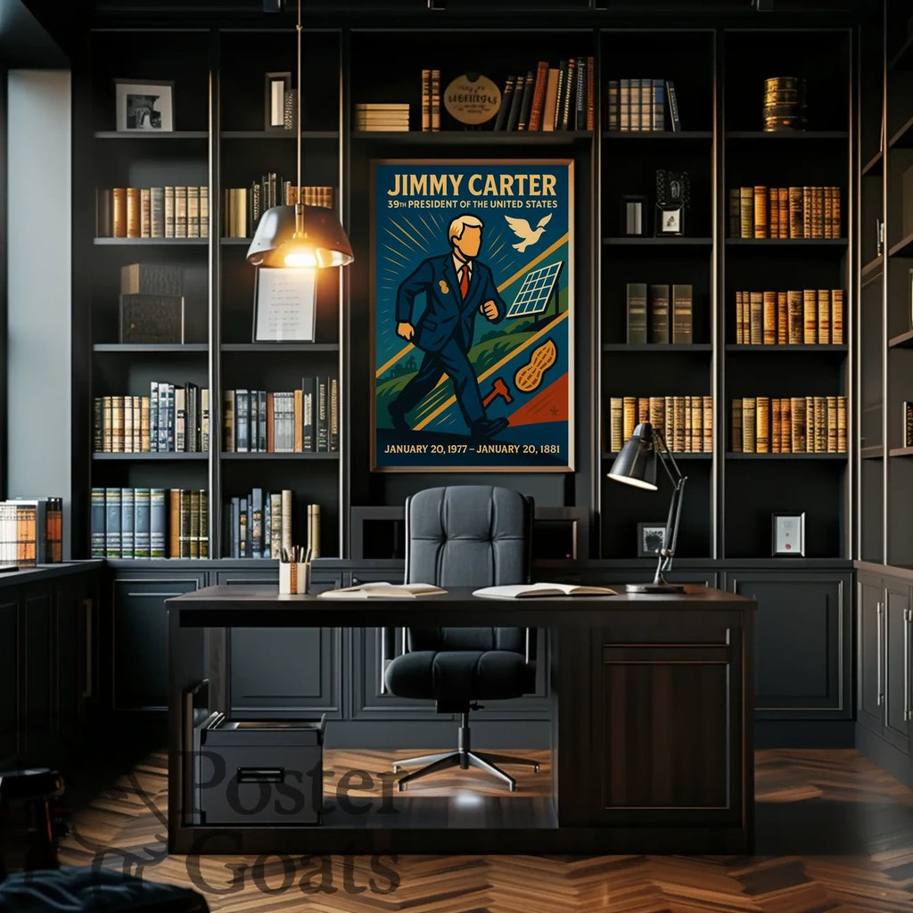 This vintage poster celebrates the iconic 39th President of the United States, Jimmy Carter, serving from 1977 to 1981. The artwork features an illustration of Carter in a suit, surrounded by significant symbols such as a dove for peace, a solar panel to highlight his renewable energy initiatives, a landscape symbolizing agricultural efforts, and a peanut reflecting his personal connection to Georgia. The bold colors and simplified forms evoke the campaign posters of the late 20th century, offering a patriotic and idealistic design. Ideal for collectors of historical and political memorabilia, this piece captures a narrative of peace and progress.