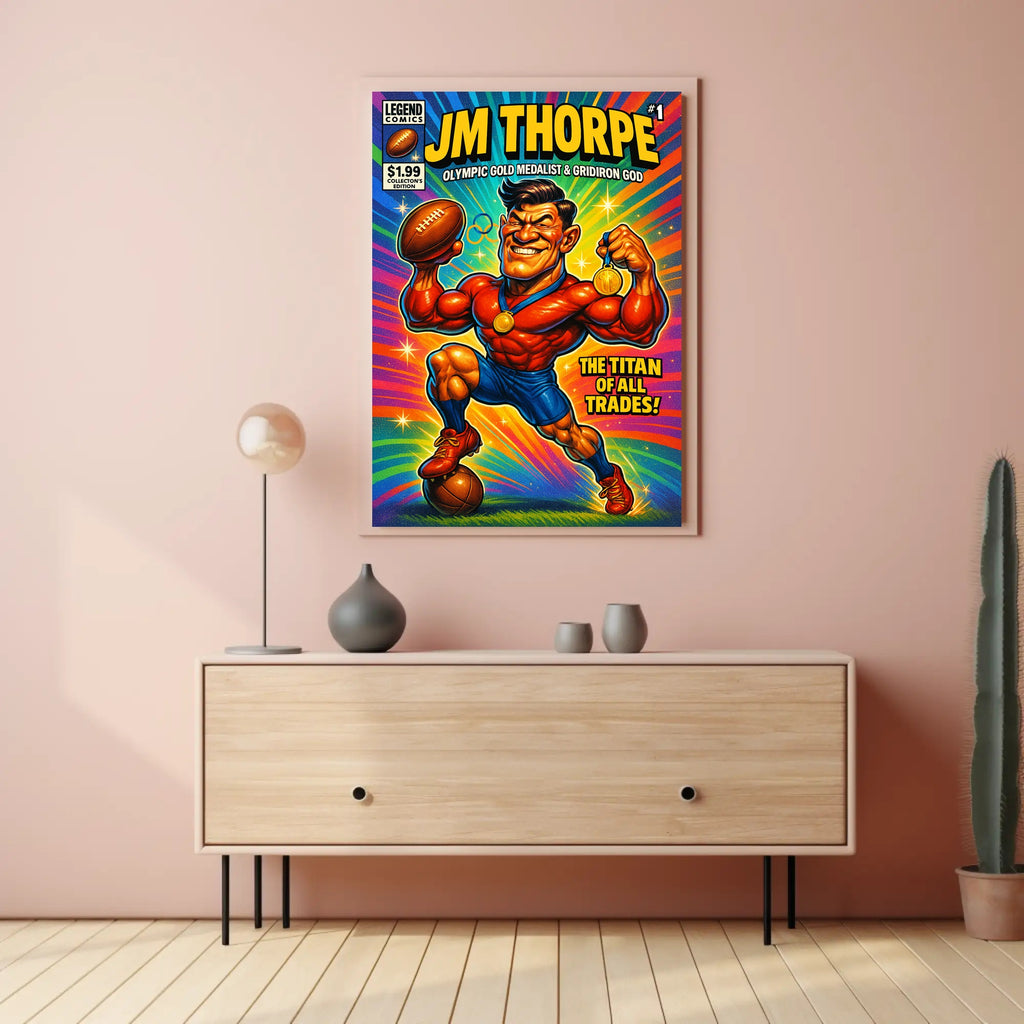 Celebrate athletic legend and vintage comic energy with the JM Thorpe – Olympic Gold Medalist & Gridiron God Poster from PosterGoat. This multicolor, pop-art inspired print captures a larger-than-life sports hero mid-victory — gold medal raised, football in hand, muscles taut — rendered in bold lines, saturated color, and dynamic comic typography that leaps off the page.