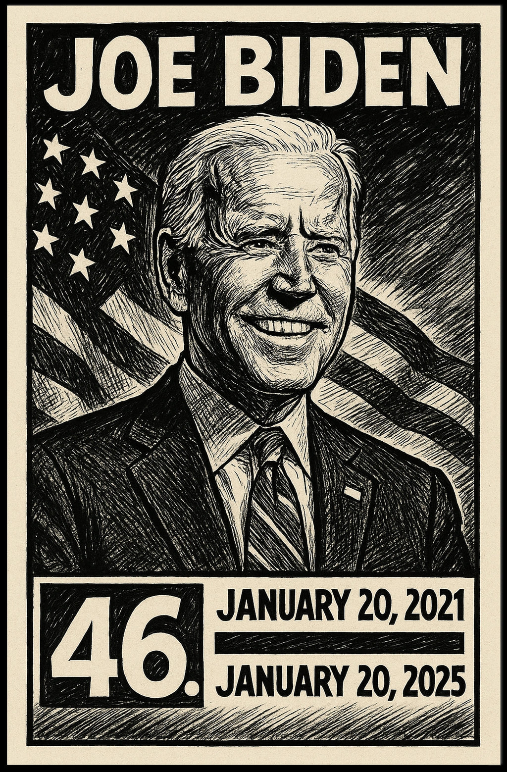 A bold black-and-white comic sketch poster featuring the 46th President, crafted for fans of history, politics, and distinctive wall art. This piece adds a conversation-starting focal point to any living space, office, or study.