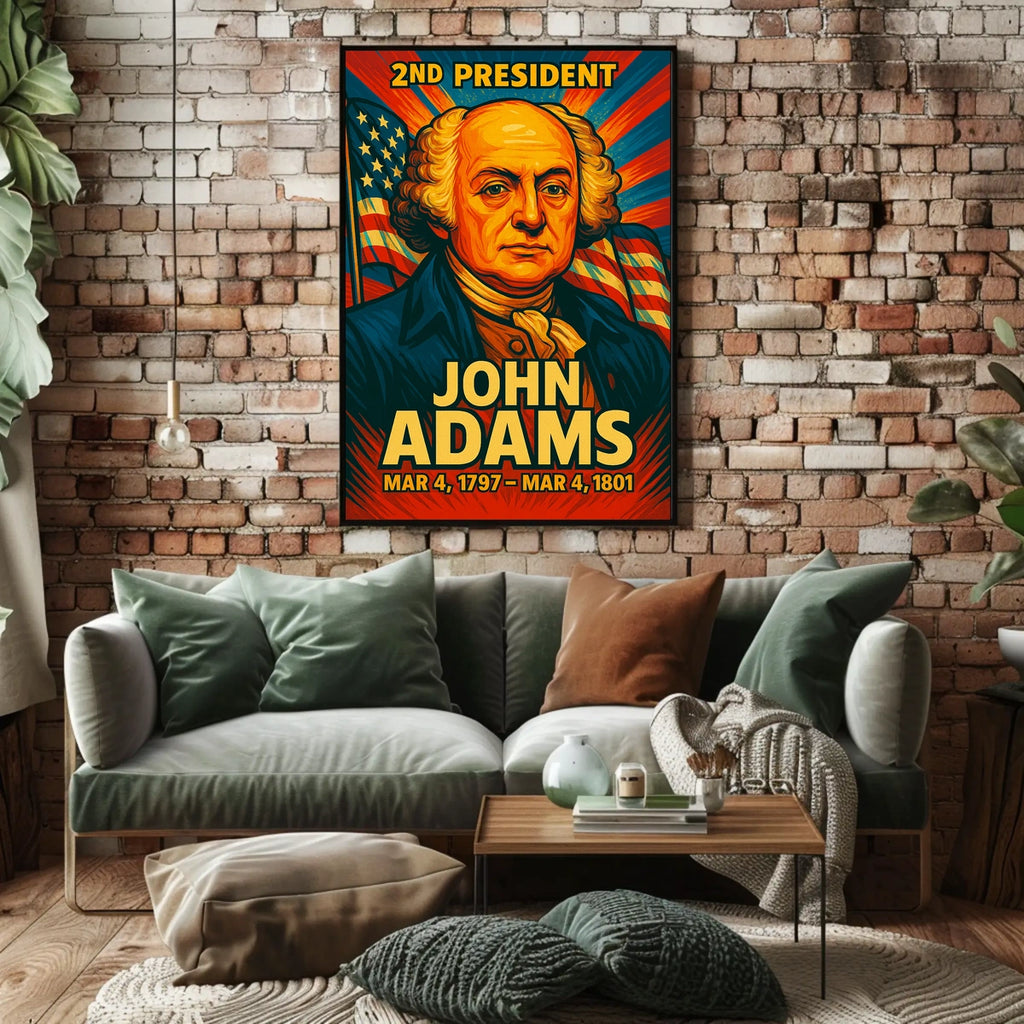 This John Adams poster blends history with contemporary pop-art flair, presenting a vibrant comic-book style portrait that honors his role as a Founding Father and key architect of the American Constitution. A bold tribute to american politics and history, it brings a touch of classic USA heritage into any room.