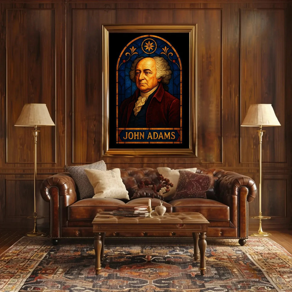 This captivating poster presents an artistic homage to John Adams, styled in a way that elegantly captures the essence of stained-glass art. The vibrant hues of blues, golds, and deep reds create a solemn atmosphere, echoing the gravitas of historical reverence. The richly detailed design suggests a powerful connection to the late 18th and early 19th centuries, making it an ideal piece for those who appreciate both history and artistry. Perfect for home decor or educational settings, this poster is not just a visual feast but a respectful nod to America's enduring legacy.