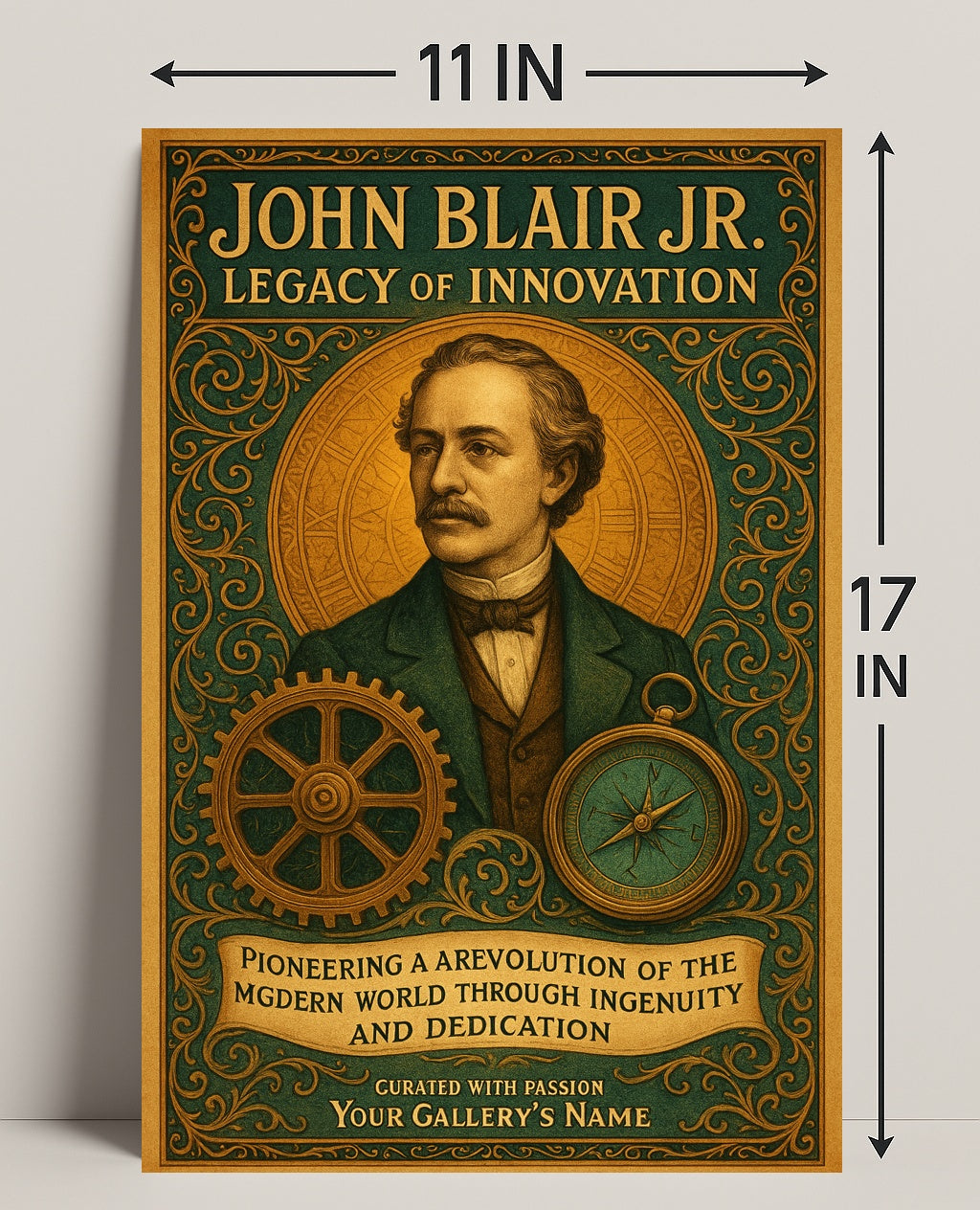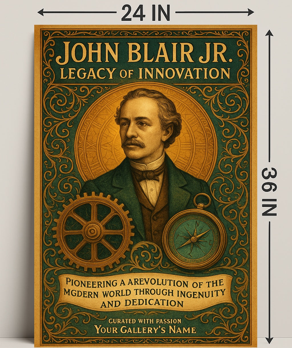 John Blair Jr. — Legacy of Innovation Poster from PosterGoat is a vintage-inspired wall art piece that celebrates invention, exploration, and timeless design. Rendered in rich gold and deep teal, this striking poster features an engraved-style portrait of John Blair Jr. surrounded by ornate filigree, a gear and compass motif, and a classic banner proclaiming a legacy of ingenuity — a perfect focal point for home, office, or a gallery wall.