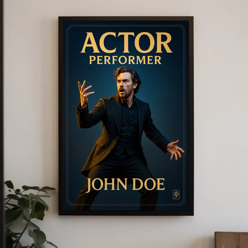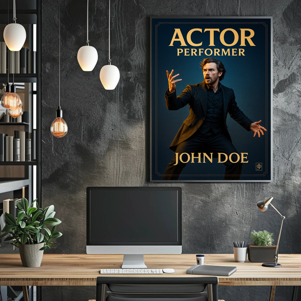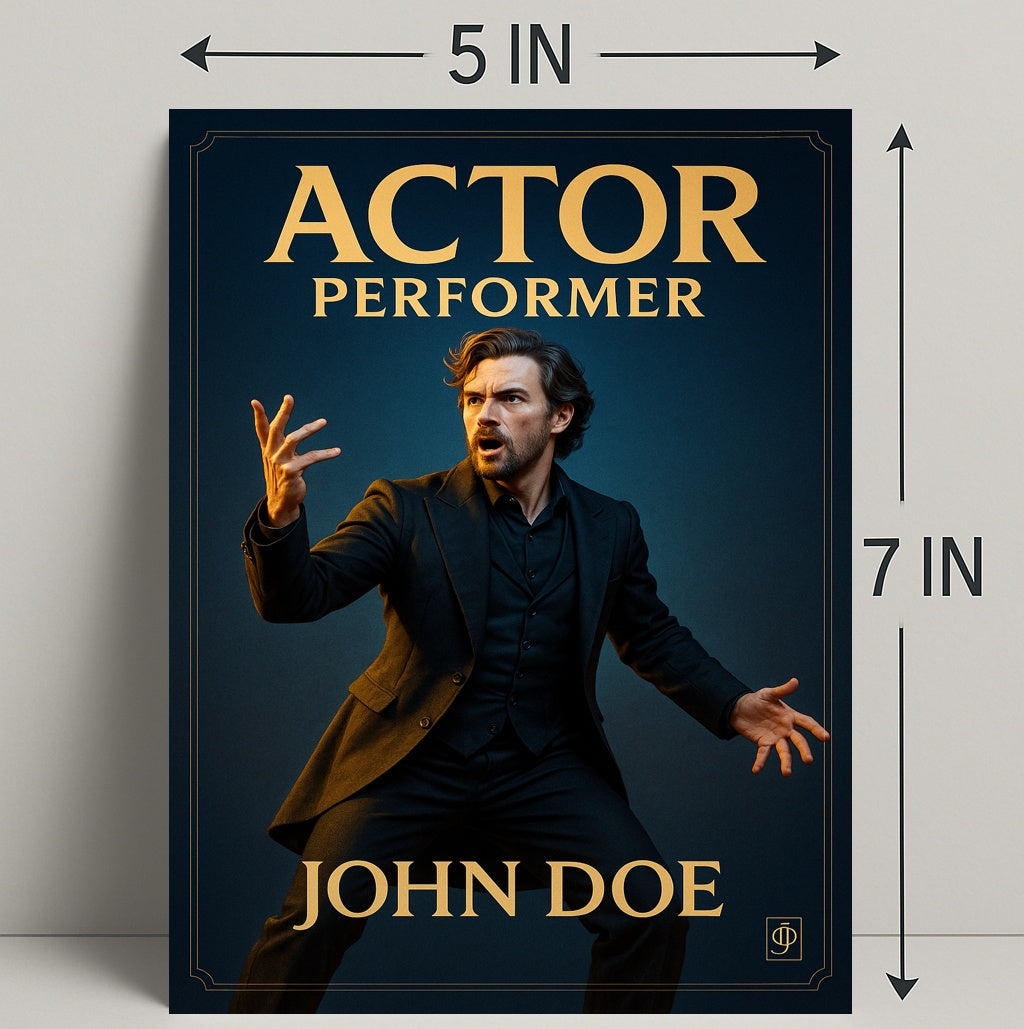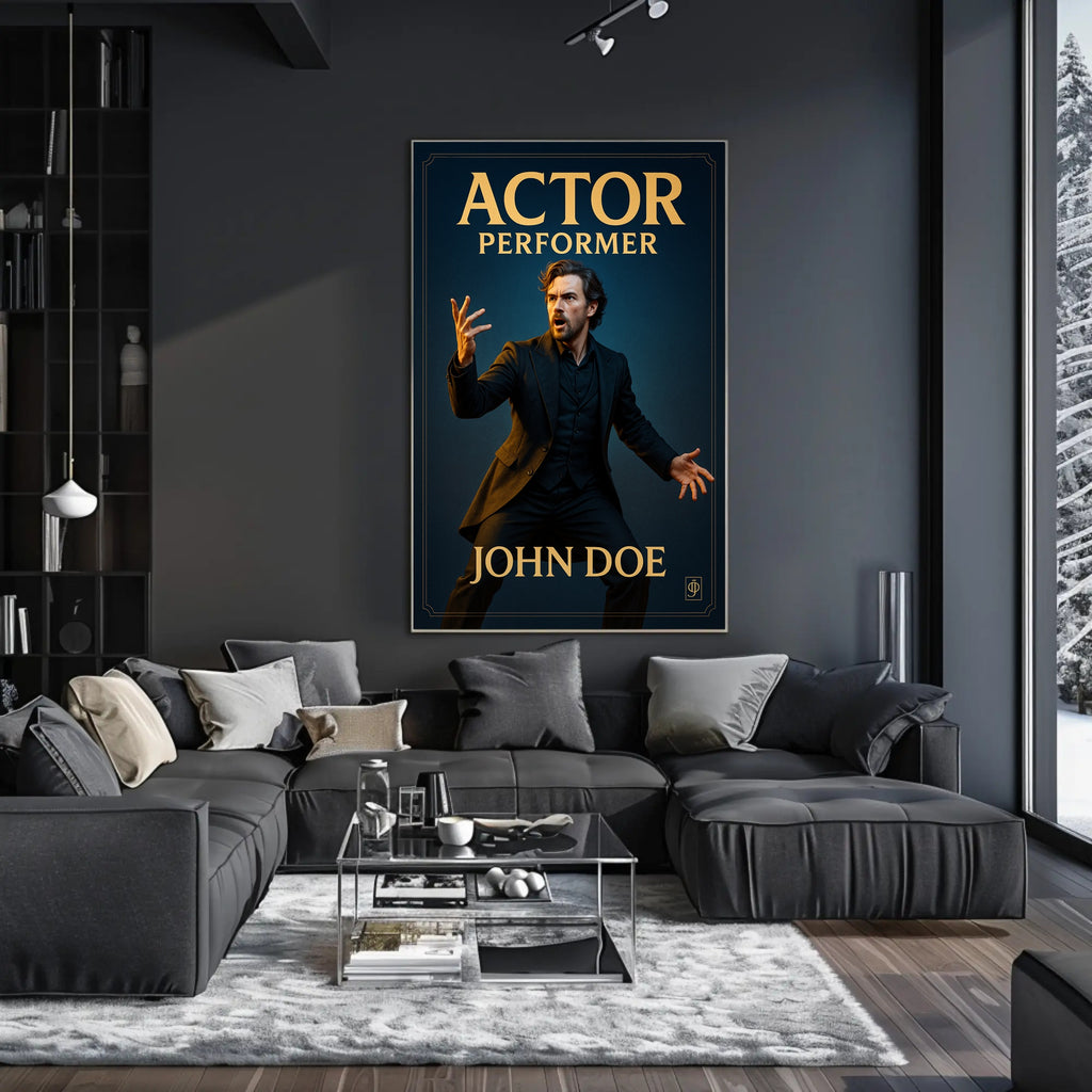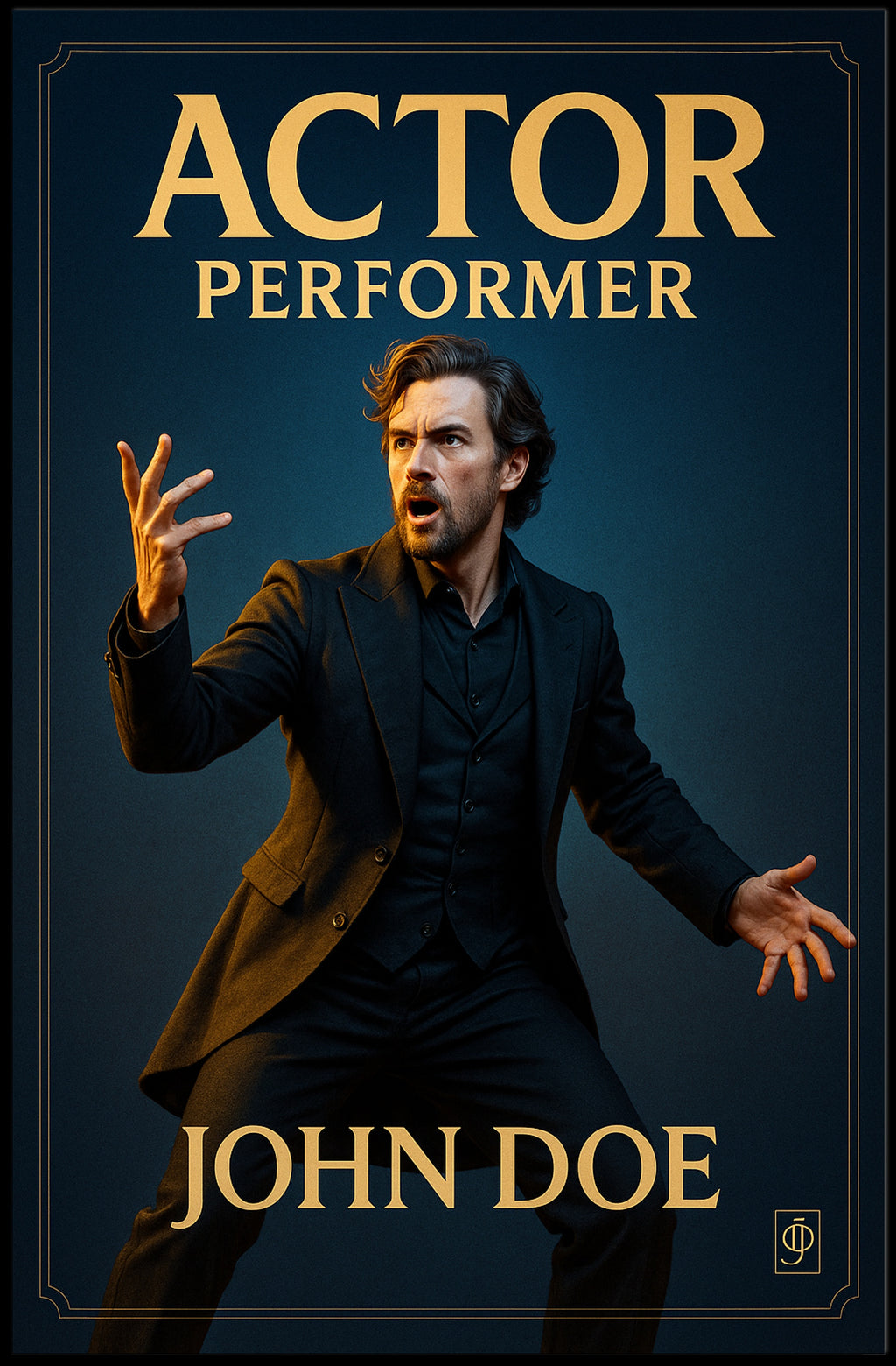 - Elegant typography & framing — large, gold-lettered headings (“ACTOR • PERFORMER • JOHN DOE”) and a refined thin-border motif deliver a vintage-poster sensibility with modern polish.