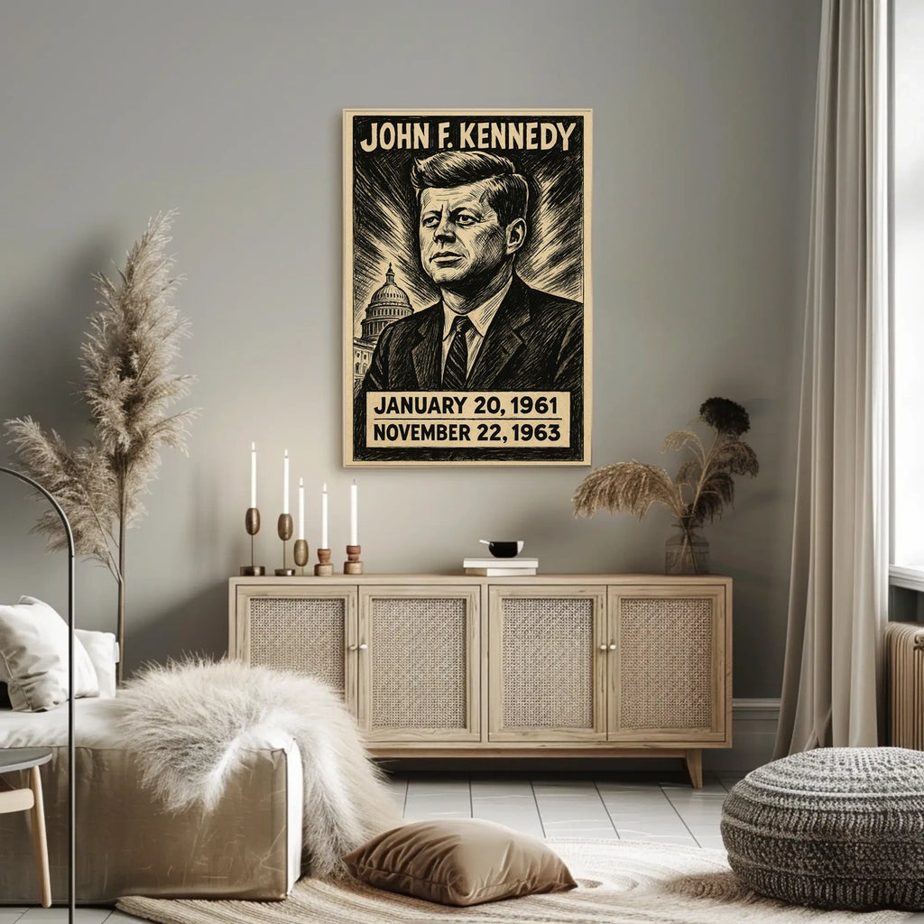Capture a landmark moment in American history with a bold black-and-white comic sketch poster of John F. Kennedy, the 35th President, designed to elevate any wall with timeless, graphic flair.