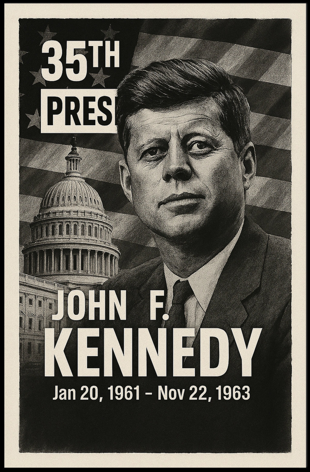 Designed for fans of american politics, history, and vintage wall art, this poster blends a classic portrait aesthetic with a modern glow that makes it pop on any wall. Perfect for creating a focal point in living rooms, study spaces, classrooms, or offices, it doubles as an educational and decorative piece that sparks conversation about American leadership, the era of JFK, and the enduring ideals of freedom and public service.