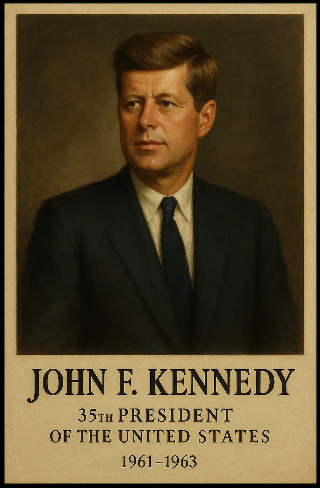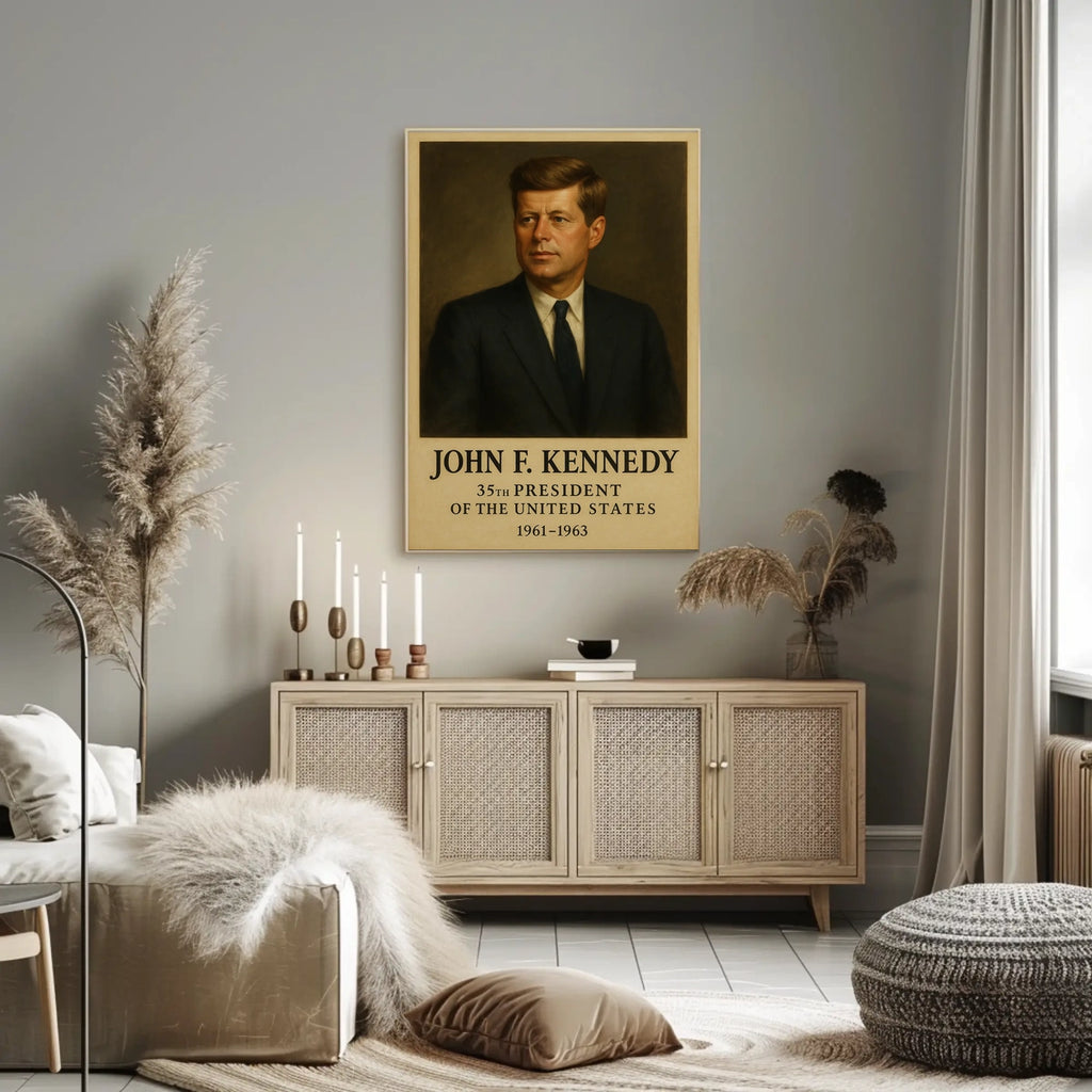 Celebrate the beauty of John F. Kennedy Portrait from the 1960s Historical Presidential Poster with this timeless wall art. Capturing the optimism and energy of the early 1960s, this poster evokes a profound sense of inspiration and leadership. As the 35th President of the United States, JFK transformed the nation with his visionary call for progress and equality. This meticulously designed historical poster reflects the era with its quintessential portrayal of this iconic figure, offering an authentic glimpse into a pivotal period of American history. Whether for a study, office, or living space, this decorative piece serves as a timeless reminder of a leader whose legacy continues to resonate in our collective consciousness.