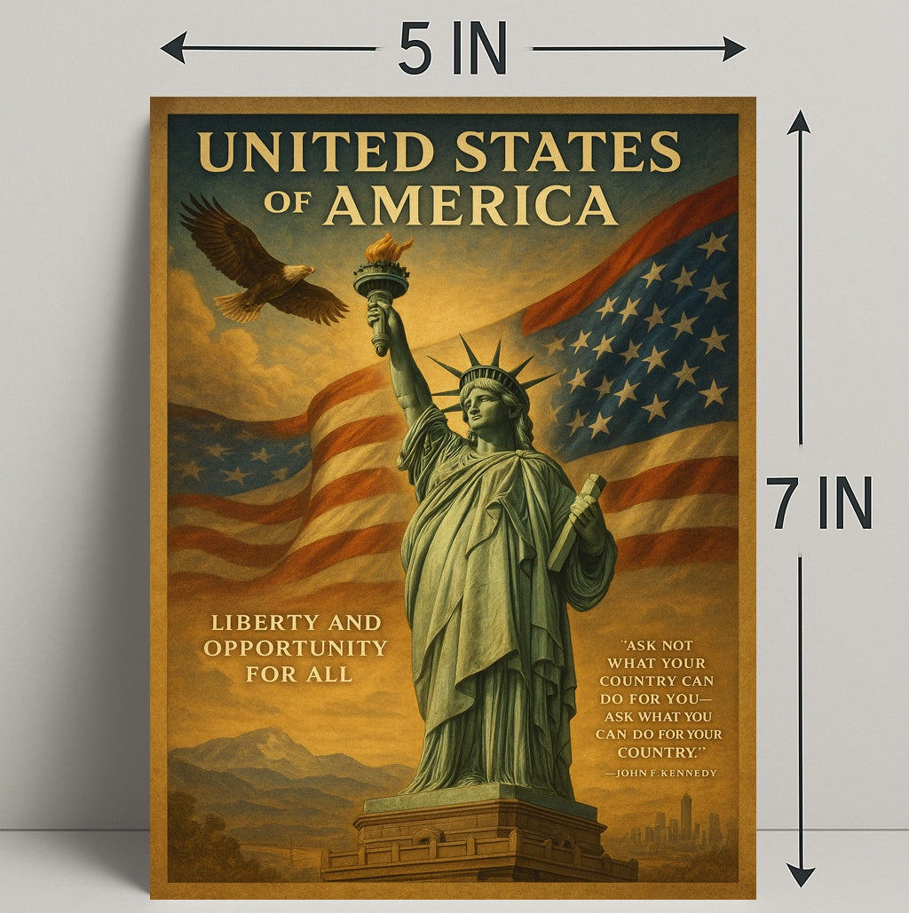 - Iconic imagery: Prominent Statue of Liberty, waving U.S. flag, and soaring eagle create an uplifting composition that evokes liberty, patriotism, and opportunity for all.