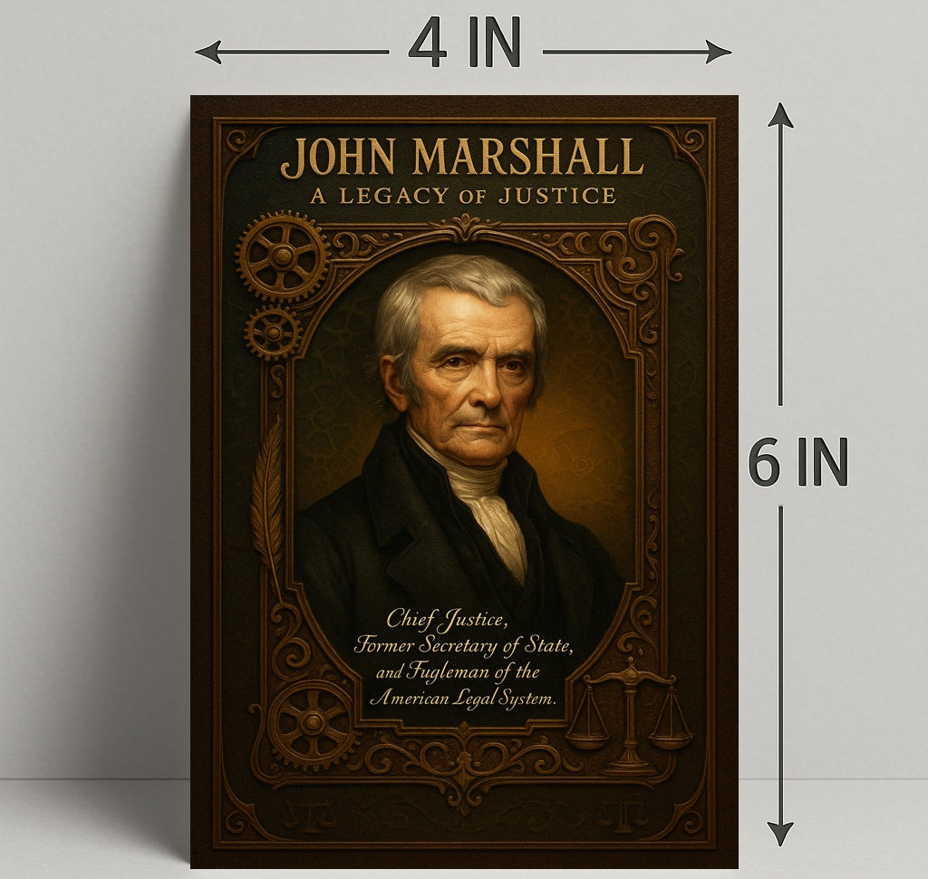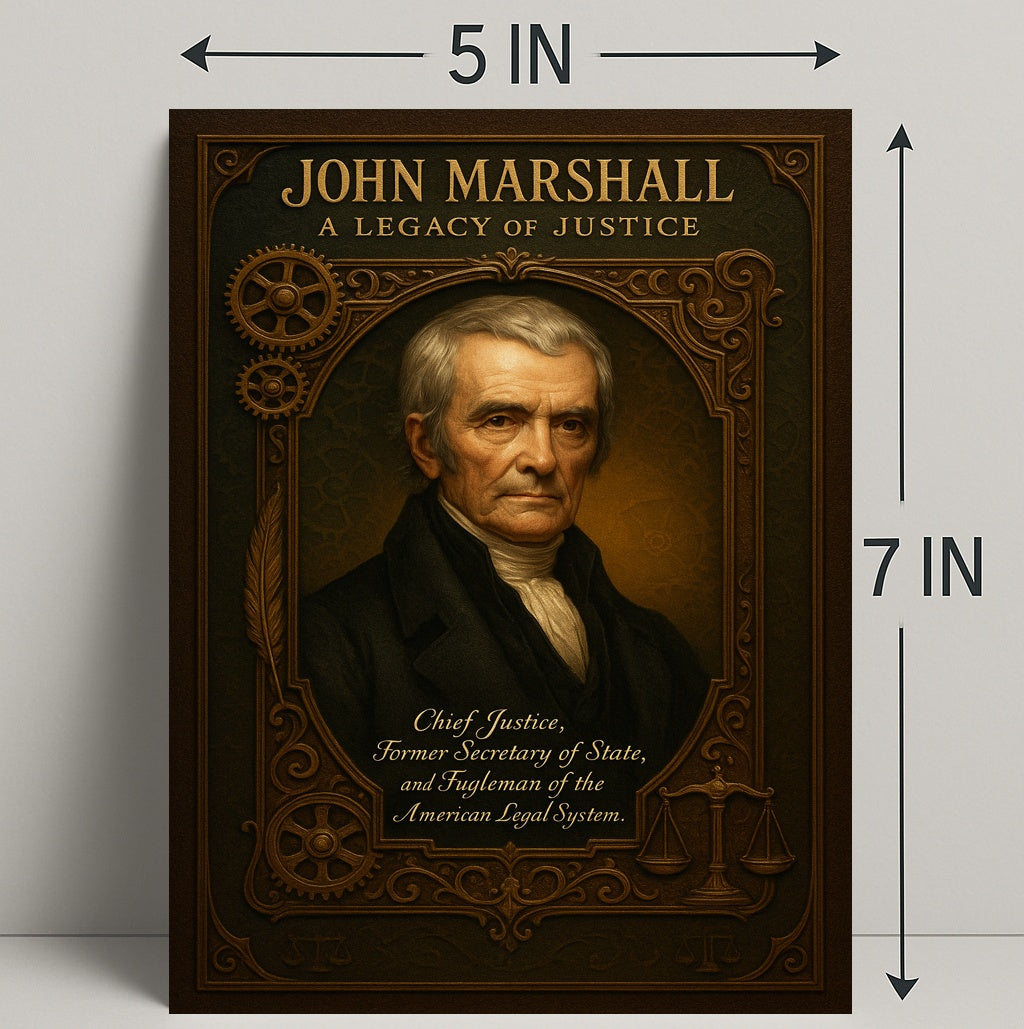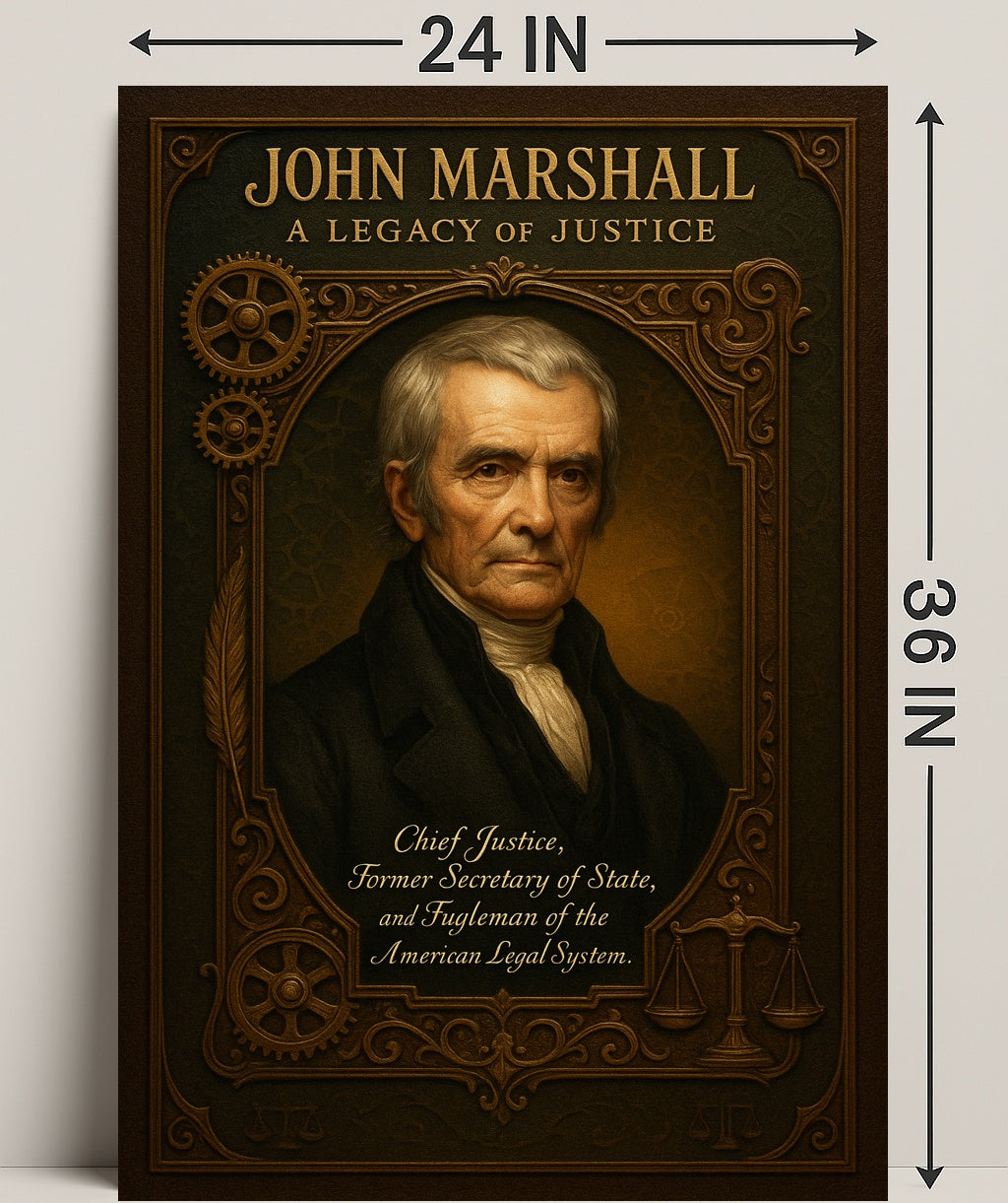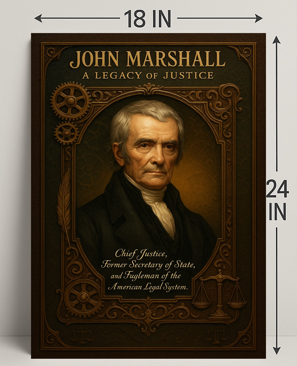Historic subject, modern presentation: A finely detailed depiction of Chief Justice John Marshall framed by ornate, vintage-inspired borders that evoke both authority and artistry.