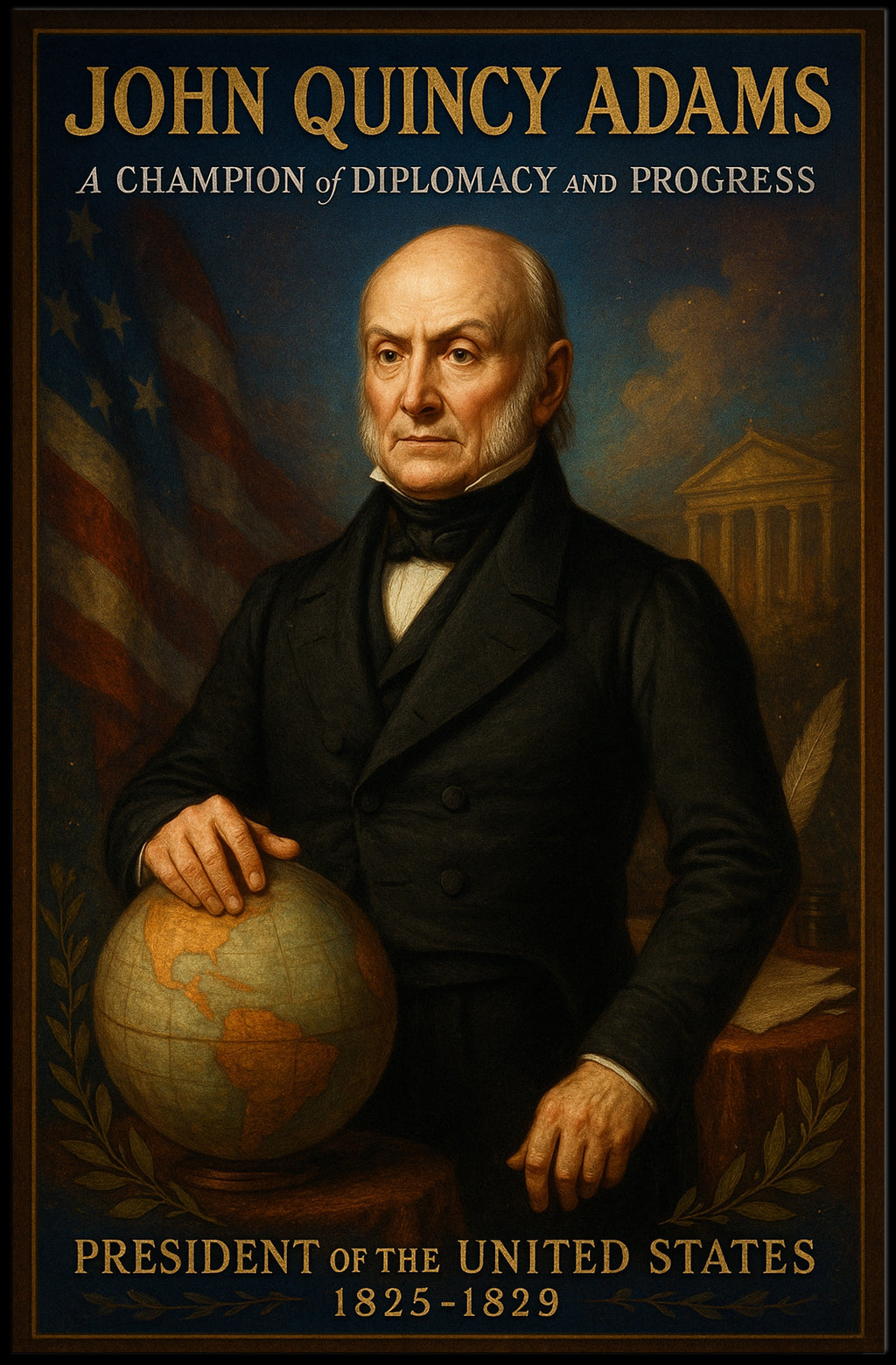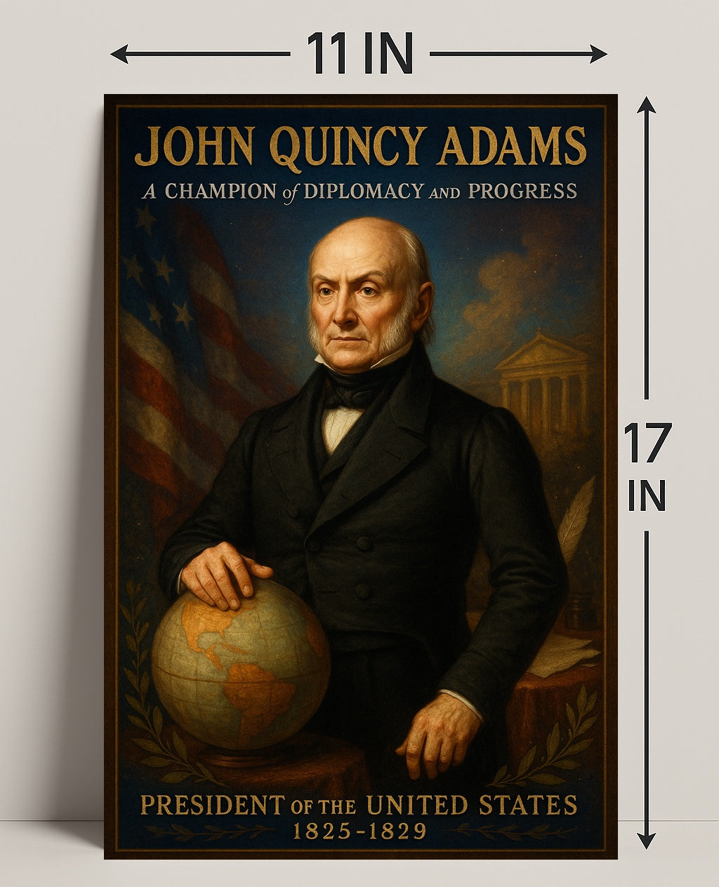 John Quincy Adams 6th President Poster — a museum-style wall art print from PosterGoat that brings early American history into any home, office, or classroom. This striking portrait captures Adams in dignified detail, hand resting on a globe with the American flag and classical architecture in the background, evoking diplomacy, statesmanship, and timeless authority.