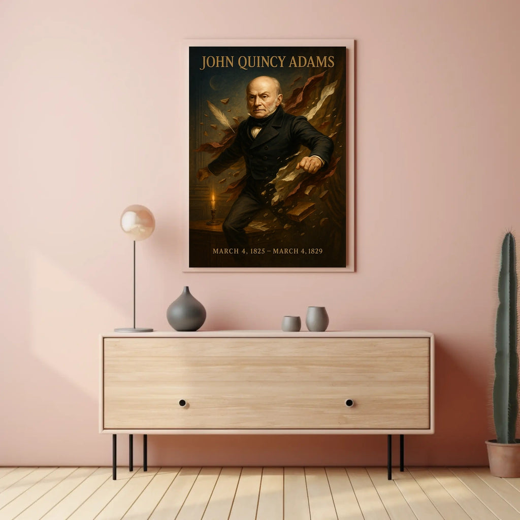 Celebrate a pivotal figure with this John Quincy Adams poster. This art print blends classic visual appeal with scenic-inspired imagery, making it a refined focal point for any room. Perfect for decor lovers and history enthusiasts seeking a tasteful, conversation-worthy addition to their walls.