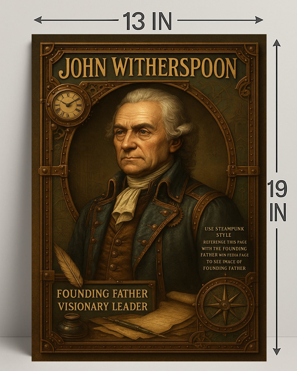 Elevate your home or office with the John Witherspoon Founding Father Poster from PosterGoat — a richly detailed, steampunk-inspired art print that celebrates an iconic figure with vintage charm and modern craftsmanship. This poster blends classical portraiture with ornate metallic accents, compass motifs and timeless typography to create a striking focal point for any wall.
