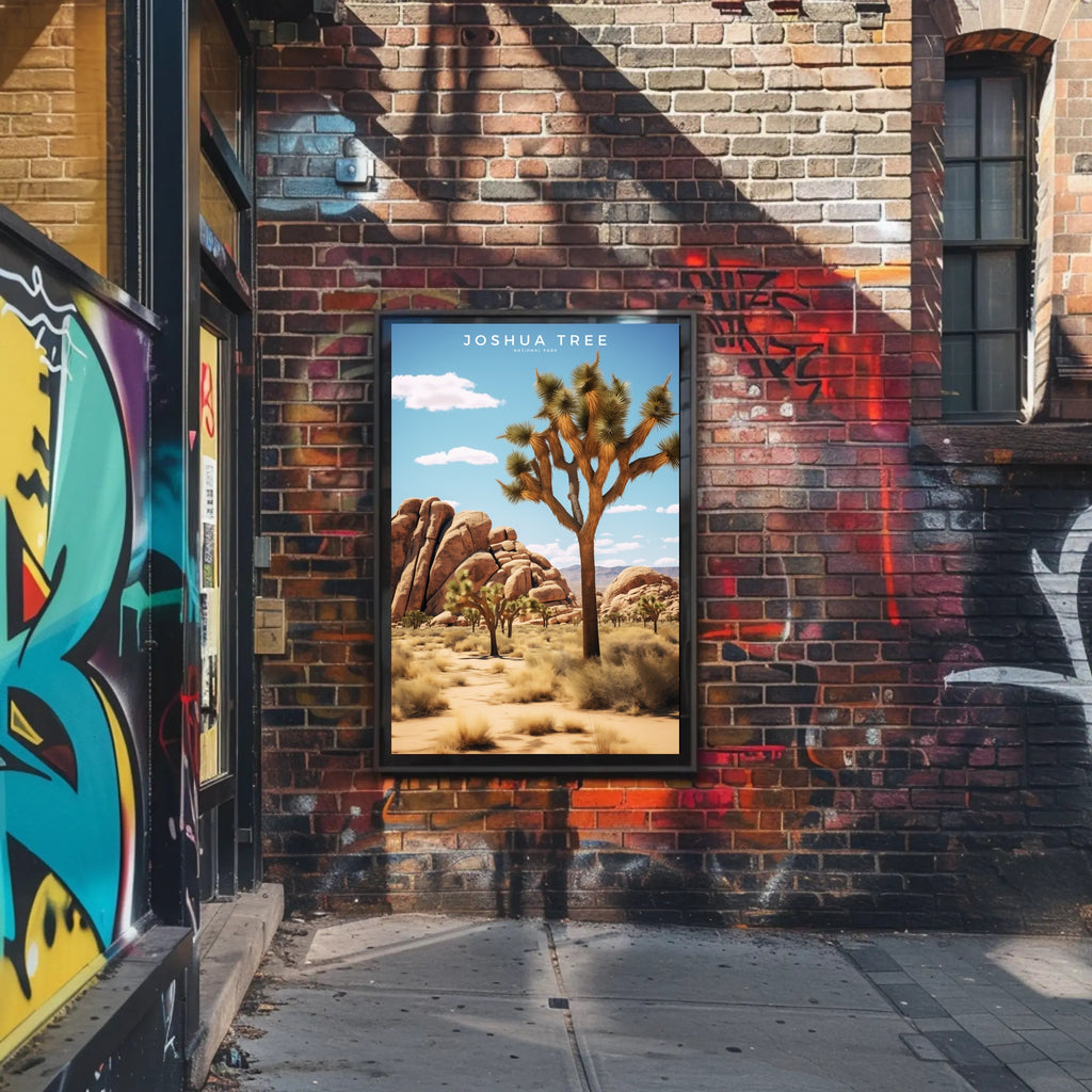 - Minimalist vintage style: Clean typography reading “JOSHUA TREE • NATIONAL PARK” and a warm, sunlit palette deliver a timeless travel-poster vibe that complements both modern and classic décor.