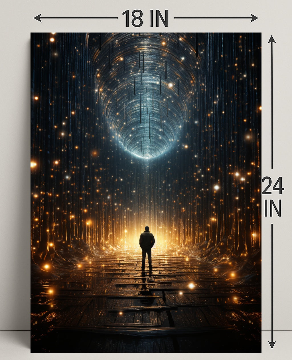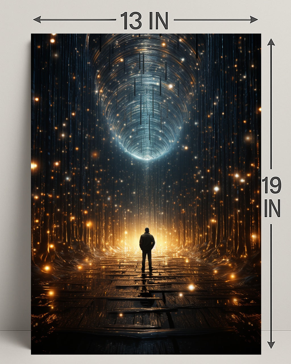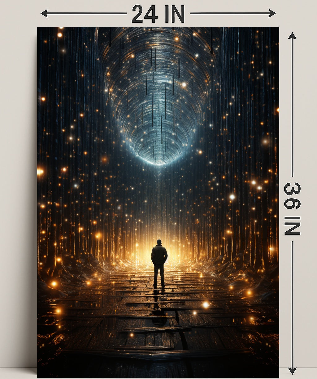 Immerse your walls in wonder with the Journey Into The Cosmos Poster from PosterGoat — a cinematic, minimalist artwork that captures a lone figure standing beneath a vaulted tunnel of stars and shimmering light. Perfect for modern living rooms, home offices, or creative studios, this print blends scenic travel-inspired imagery with cosmic, artful design to evoke curiosity and calm in equal measure.