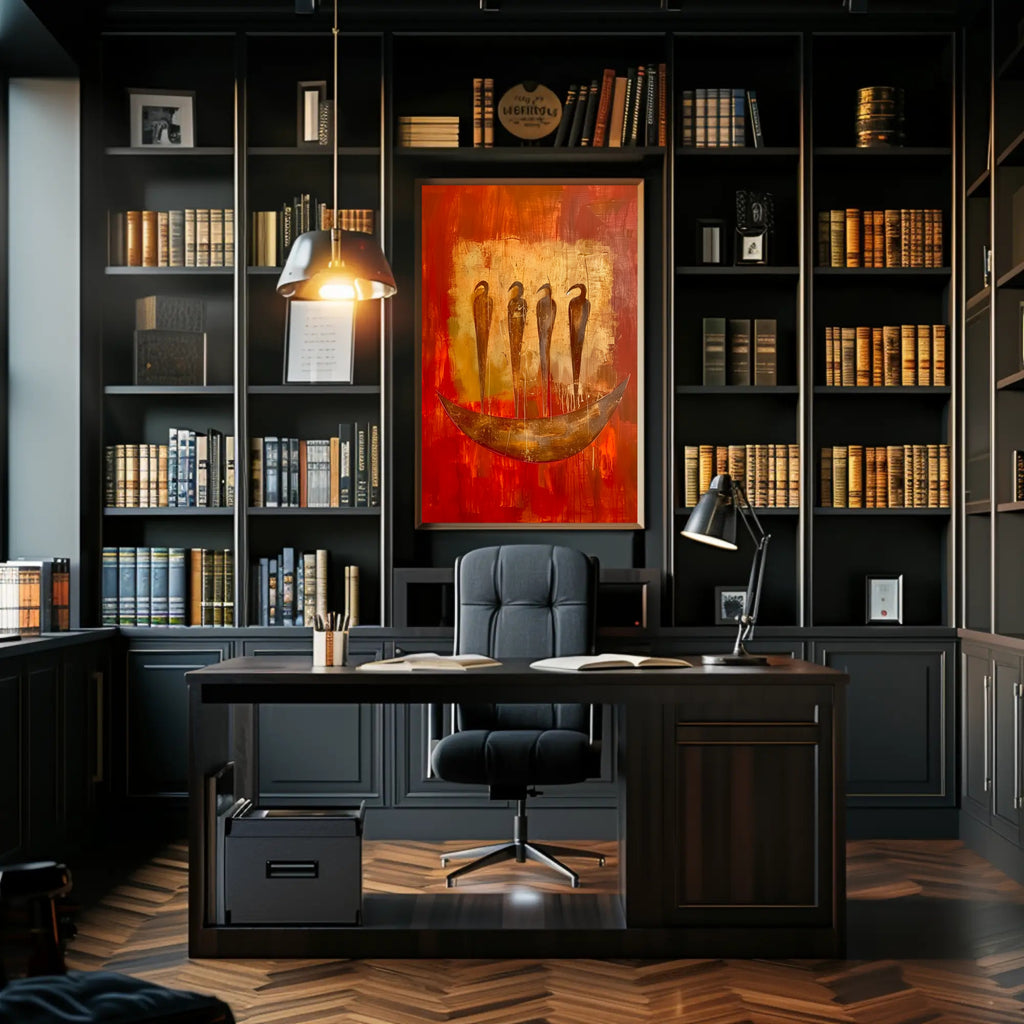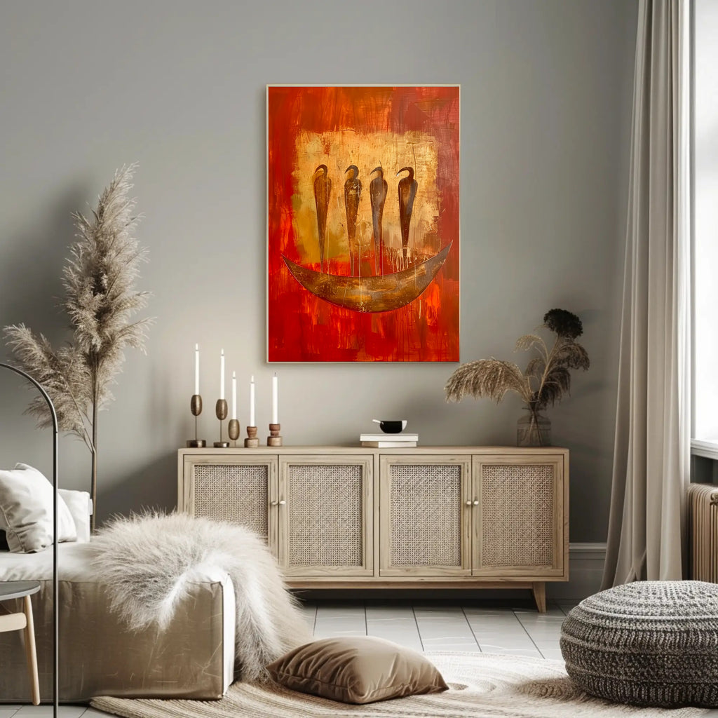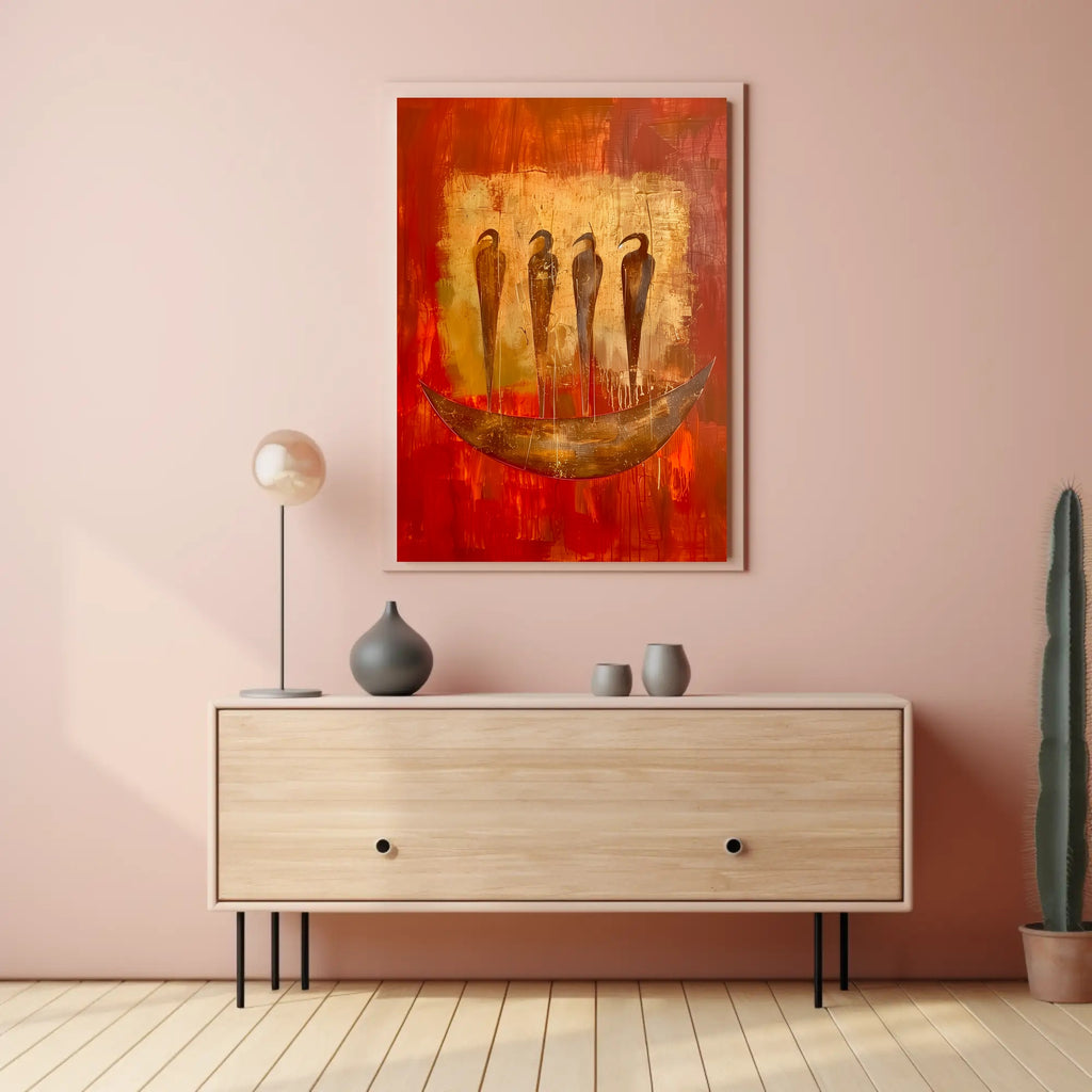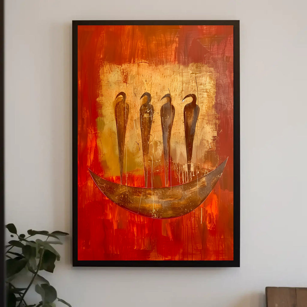 Journey of Transformation is an evocative abstract poster from PosterGoat that brings warm, fiery energy to any room. Rich reds, oranges and golds create a layered, textured background that frames four elongated, stylized bird-like figures standing above a sweeping crescent — a composition that invites reflection on myth, movement, and transformation.