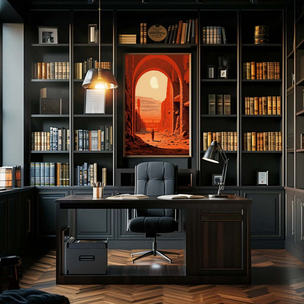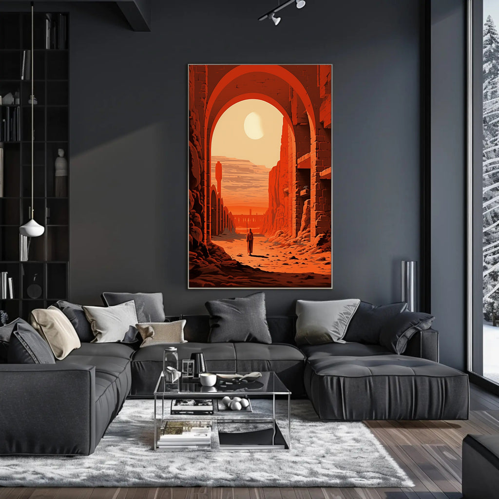 Striking composition: Bold vertical arches create a dramatic gateway effect that draws the eye toward the distant canyon and oversized sun—perfect for making a statement on living room, office, or hallway walls.