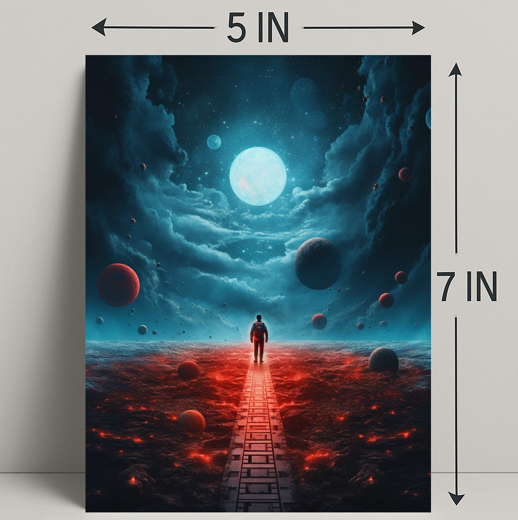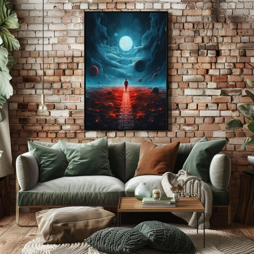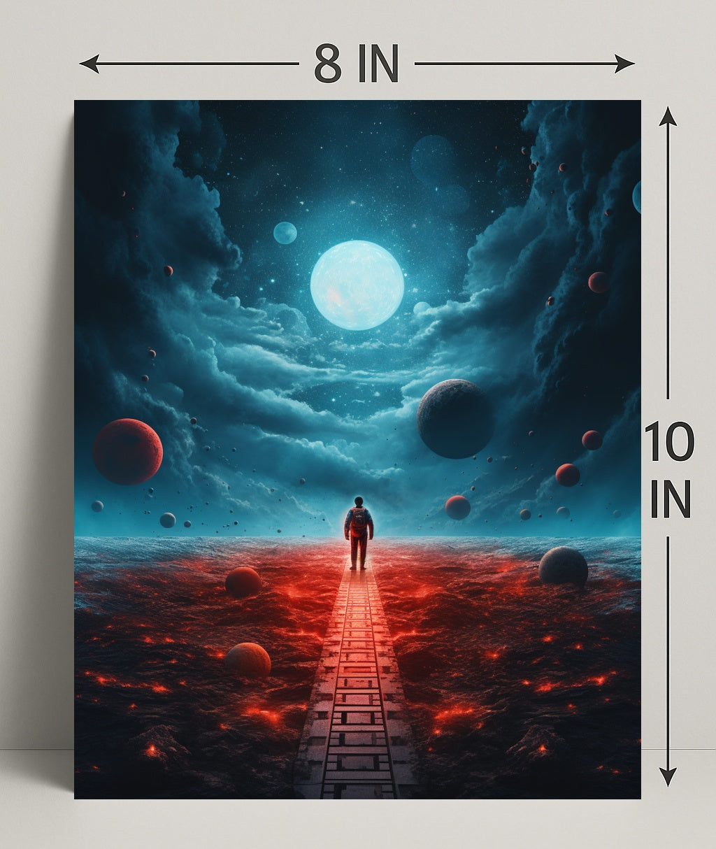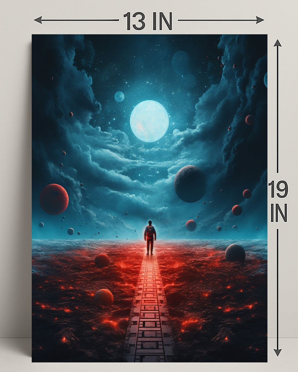 Journey Through The Cosmos Poster — an evocative art print from PosterGoat that transforms any wall into a portal to the stars. This minimalist, travel-themed poster captures a lone traveler walking a narrow pathway across a glowing red landscape toward a luminous blue moon suspended in a turbulent, planet-filled sky. The dramatic contrast of deep cyan clouds and ember-like terrain creates a cinematic focal point for living rooms, bedrooms, offices, or creative studios.
