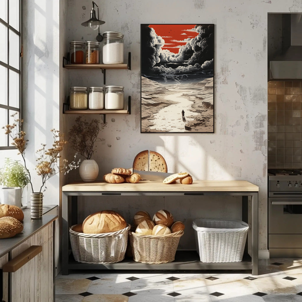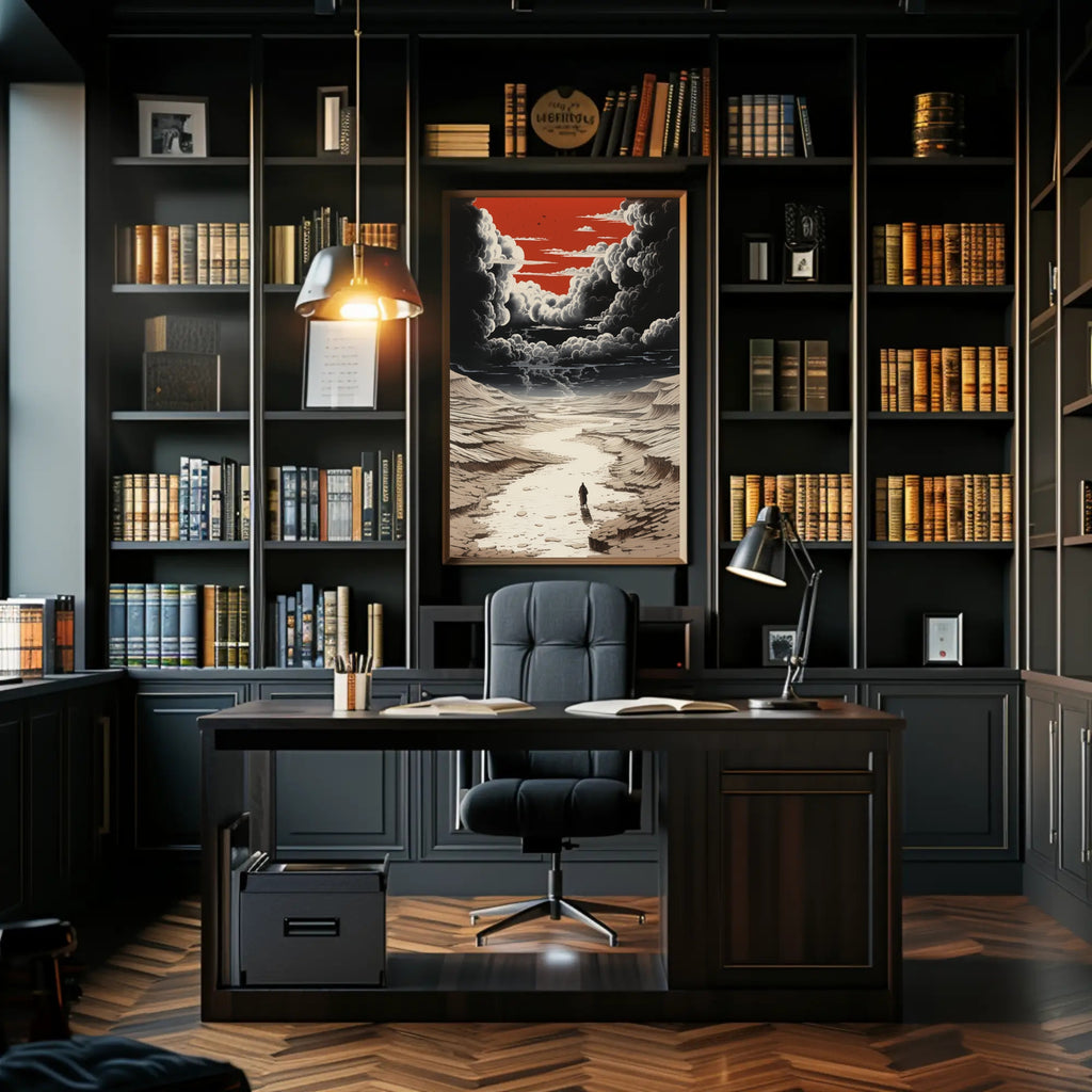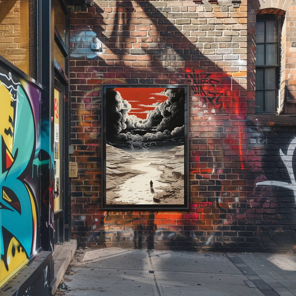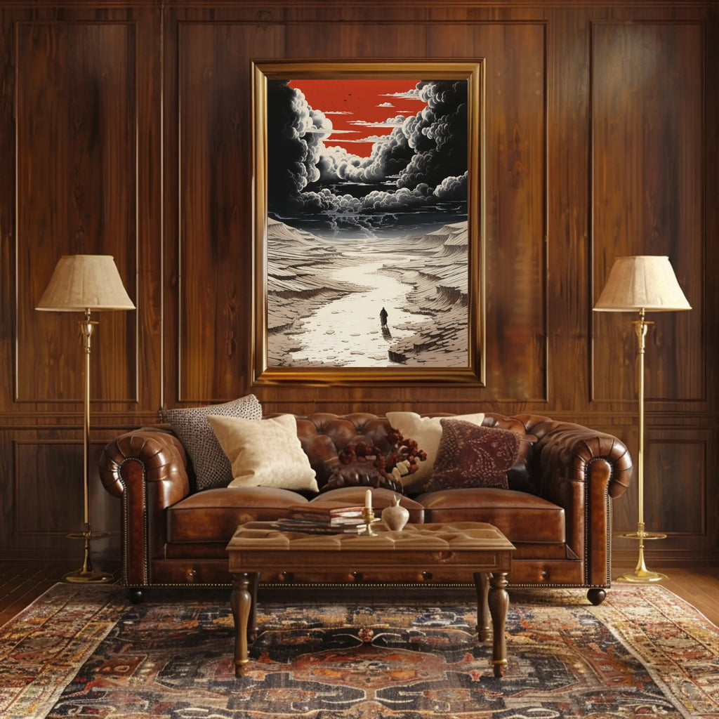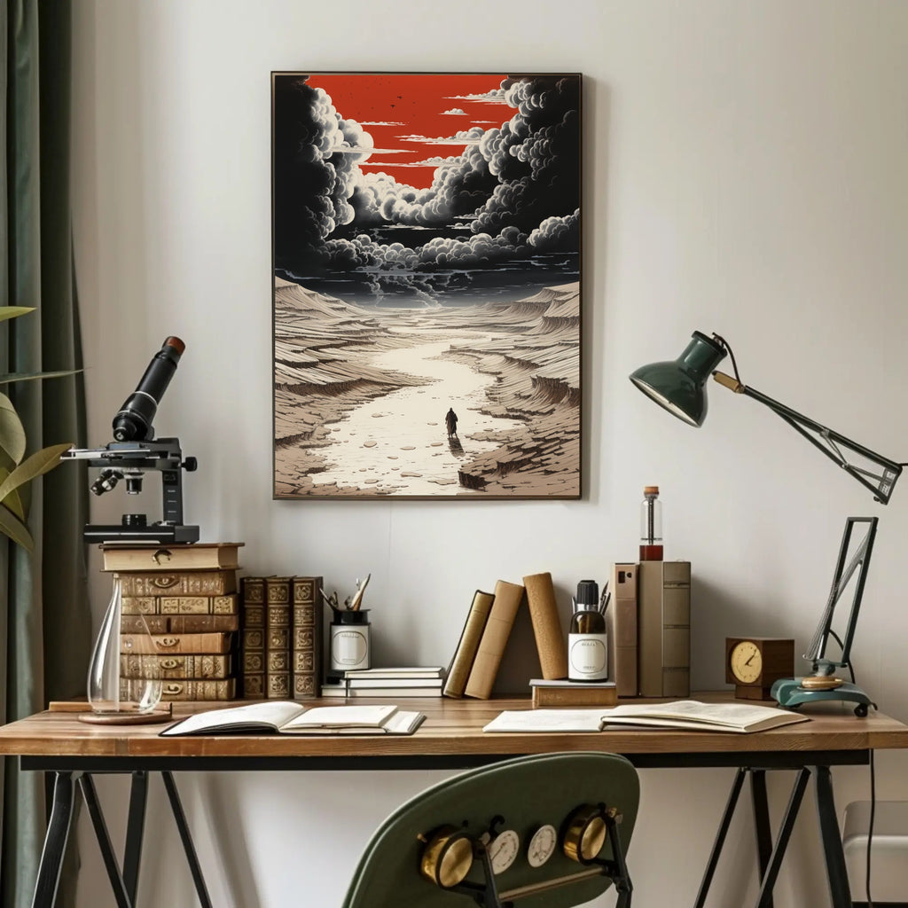 The poster’s dramatic vertical composition and finely rendered details make it an impactful statement piece whether hung solo or as part of a curated wall gallery. Its neutral desert palette with a bold red sky allows easy integration into modern, Scandinavian, and minimalist interiors.