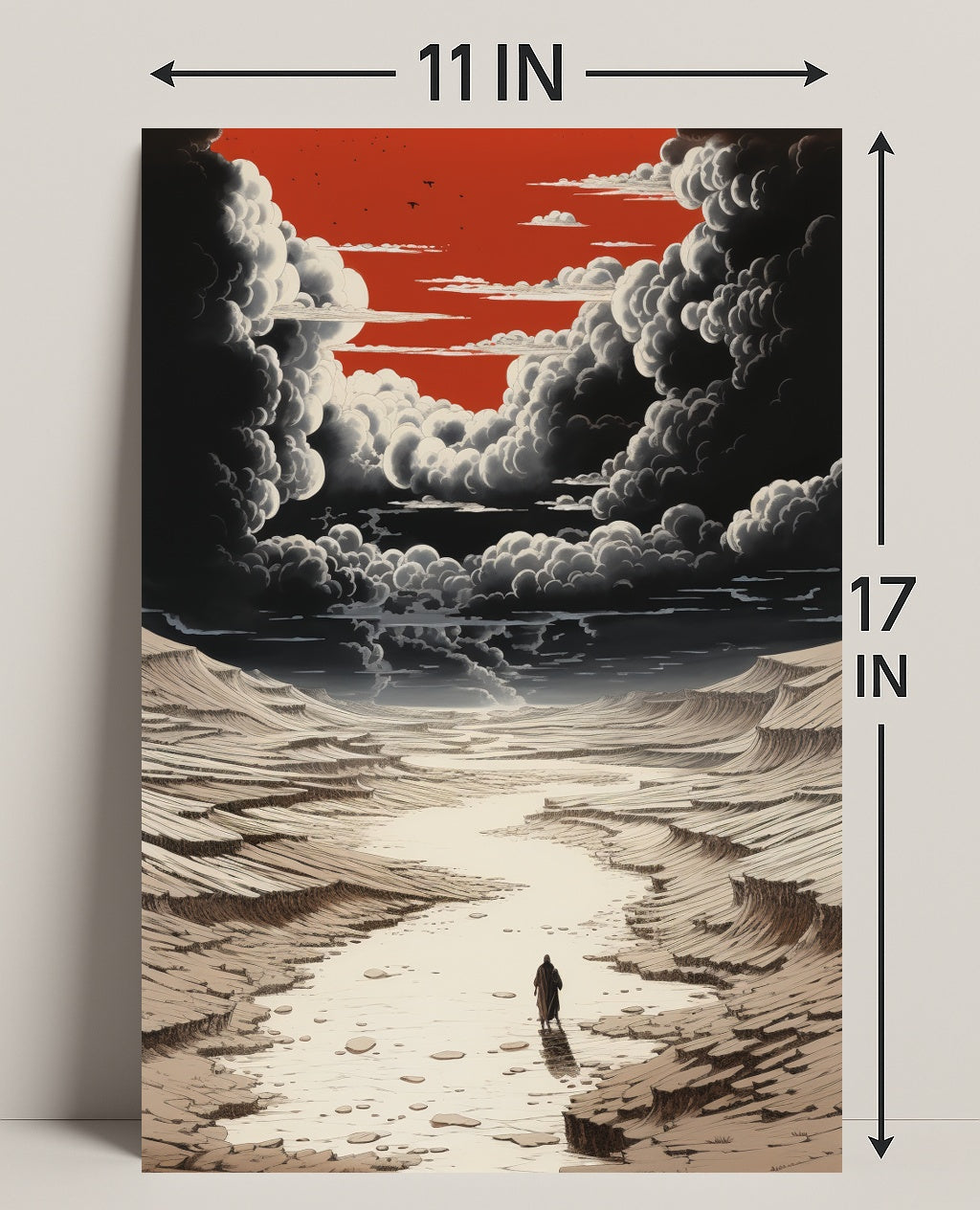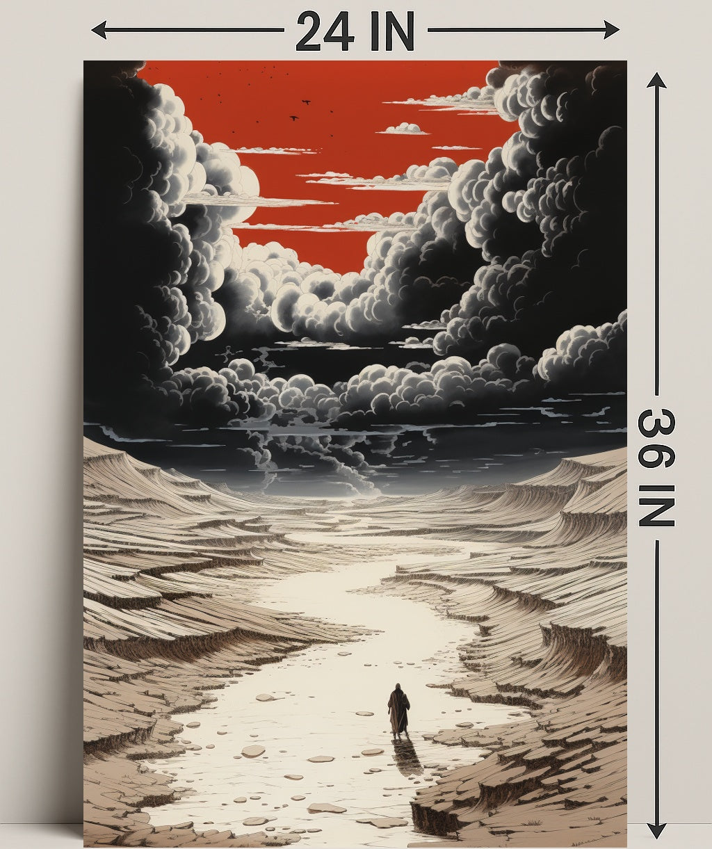 Journey Through The Desert Poster — an evocative art print from PosterGoat that transforms any wall into a cinematic landscape of solitude and discovery. This minimalist, travel-inspired poster captures a lone traveler crossing a carved desert basin beneath towering, sculpted clouds and a striking red sky — a perfect piece for home decor, office walls, or as a thoughtful gift for those who love scenic, narrative artwork.