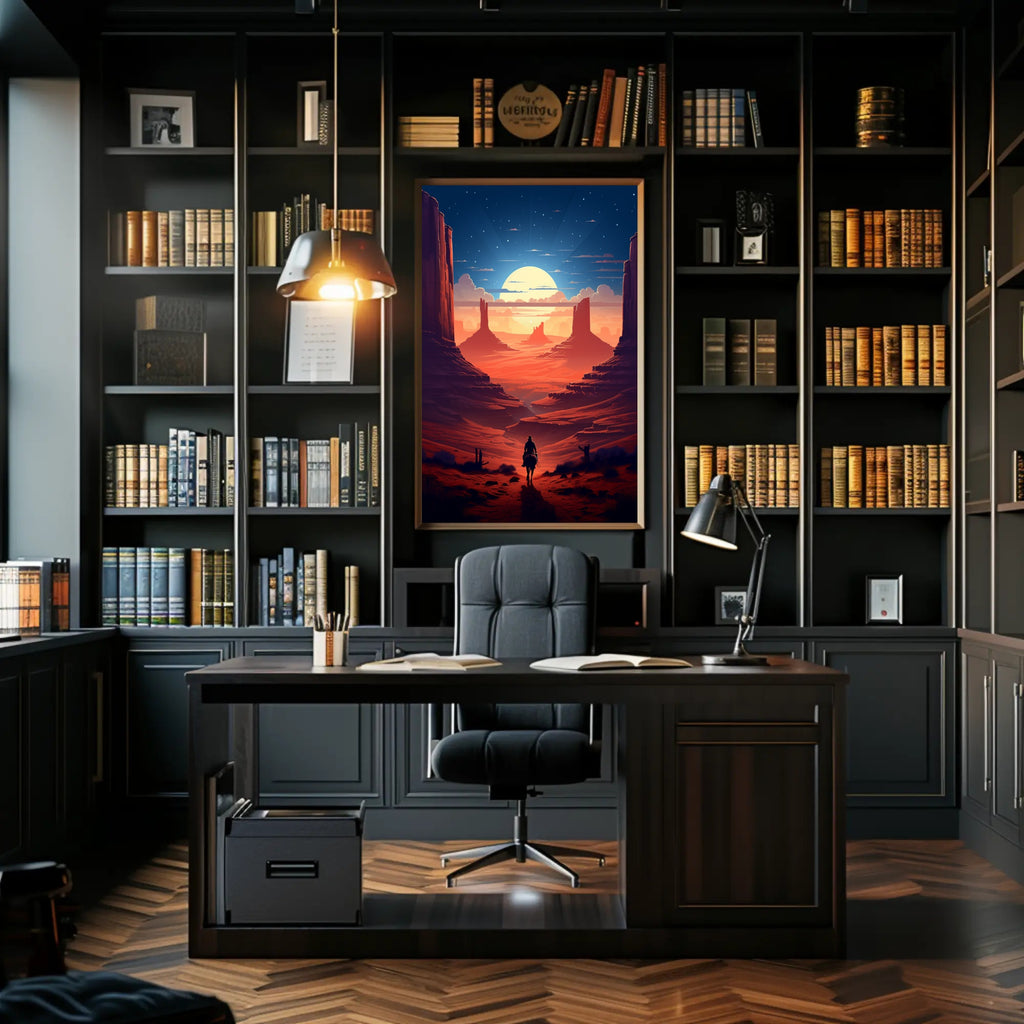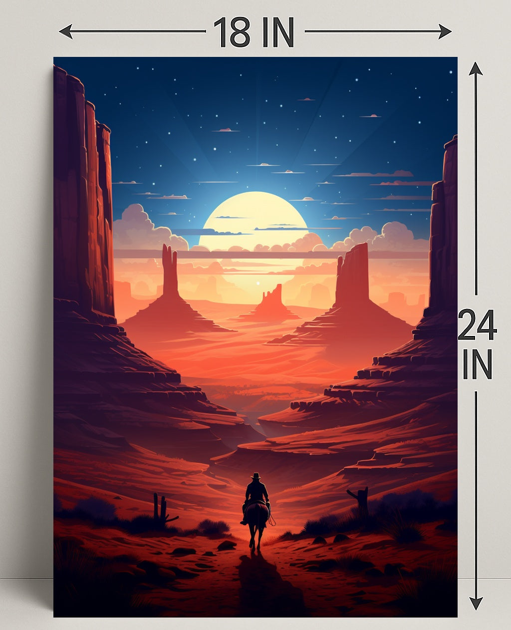 Capture the spirit of adventure with the "Journey Through The Desert Poster" from PosterGoat — a striking art print that transforms any wall into a cinematic landscape. This minimalist poster features a lone rider descending into a sweeping canyon beneath a radiant sun and star-studded sky, rendered in rich reds, deep indigos, and warm golden light that evoke the vast silence and romance of the desert at dusk.
