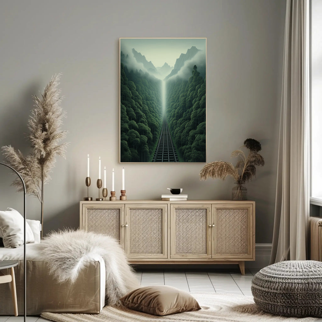 Why it captivates: The poster's deep greens and soft, diffused light create a meditative mood perfect for living rooms, offices, or reading nooks. The dramatic perspective of the railway gives the piece cinematic depth, while the misty mountain backdrop adds a timeless, travel-inspired narrative that appeals to lovers of nature, vintage collage aesthetics, and wanderlust-themed wall art.