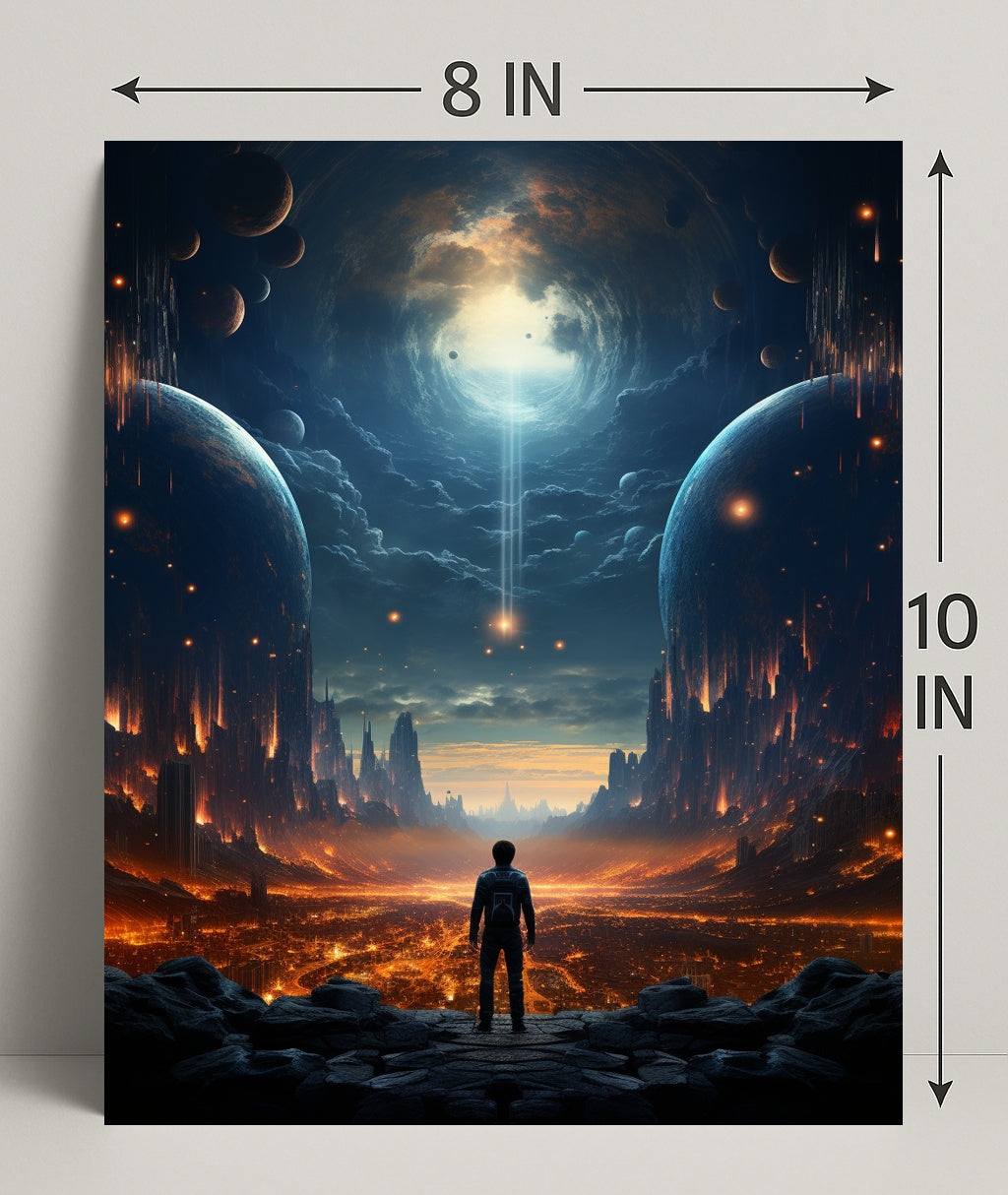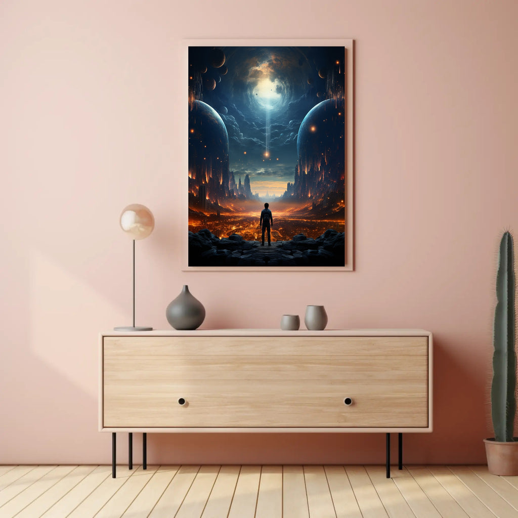 Bring the mysteries of outer space into your home with the Journey To The Cosmic Abyss Poster from PosterGoat — an evocative piece of wall art that blends cinematic scale with minimalist aesthetic. A lone explorer stands on a rocky overlook, gazing into a cavernous cosmic vortex framed by twin planets and a burning, city-like landscape below. Rich navy blues and molten oranges create a dramatic contrast that captures the imagination and anchors any room with bold visual storytelling.
