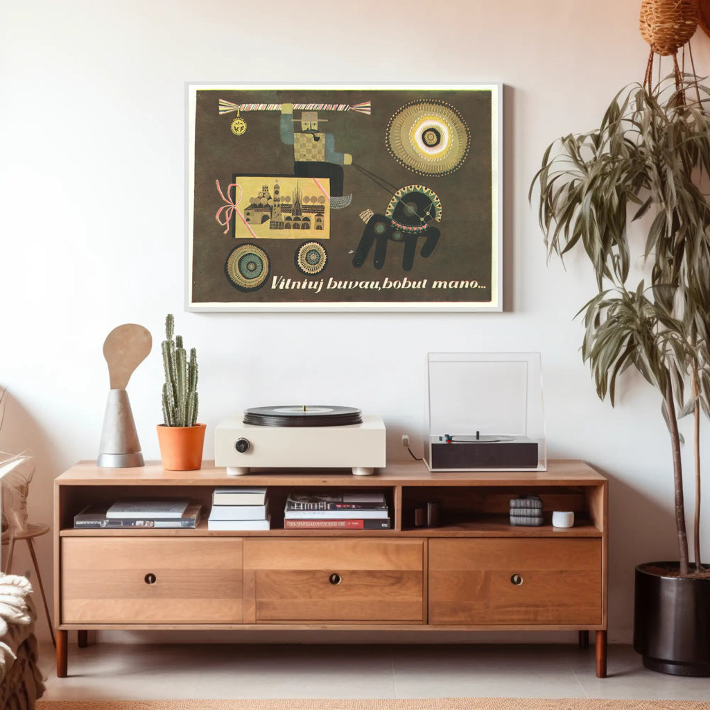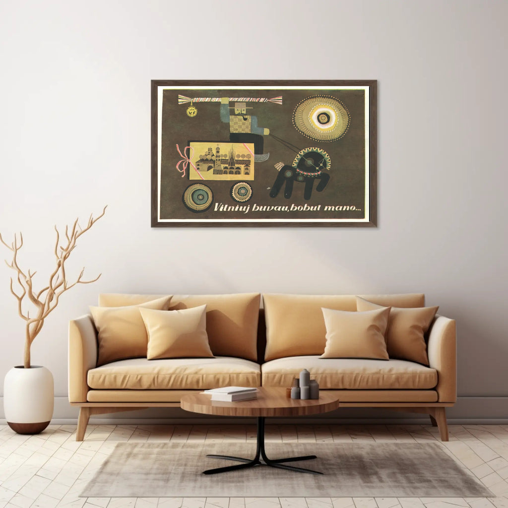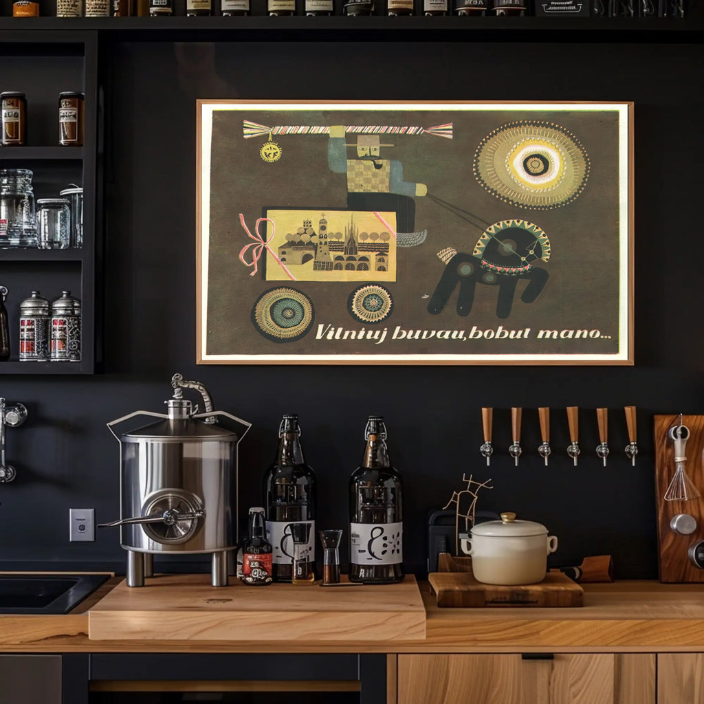 Journey to Vilnius Poster by PosterGoat — a vintage-inspired art print that brings the romance of travel and the charm of Lithuanian folk motifs into your home. This poster features a collage-style composition: a stylized carriage, whimsical circular medallions, and a framed cityscape echoing Vilnius' towers, all rendered in warm, muted browns and golds for an authentic retro feel.