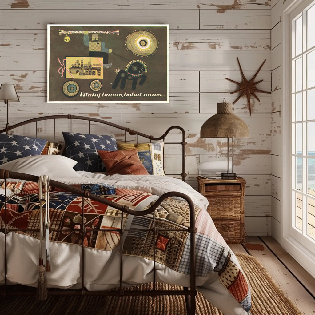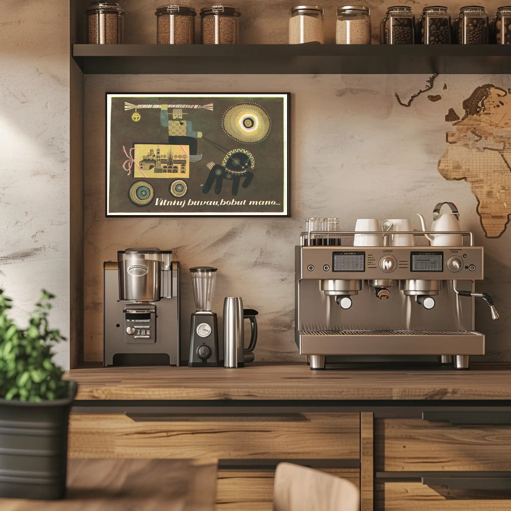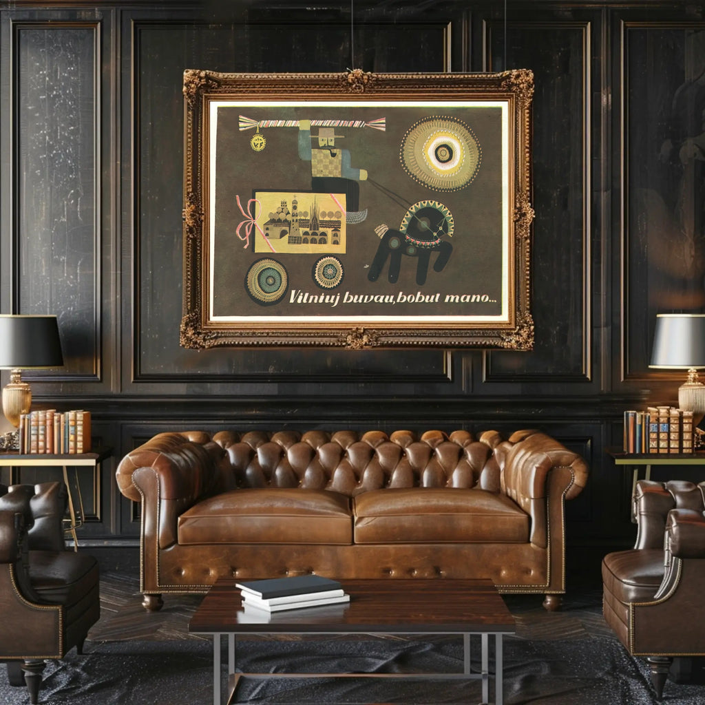 Journey to Vilnius Poster by PosterGoat — a vintage-inspired art print that brings the romance of travel and the charm of Lithuanian folk motifs into your home. This poster features a collage-style composition: a stylized carriage, whimsical circular medallions, and a framed cityscape echoing Vilnius' towers, all rendered in warm, muted browns and golds for an authentic retro feel.