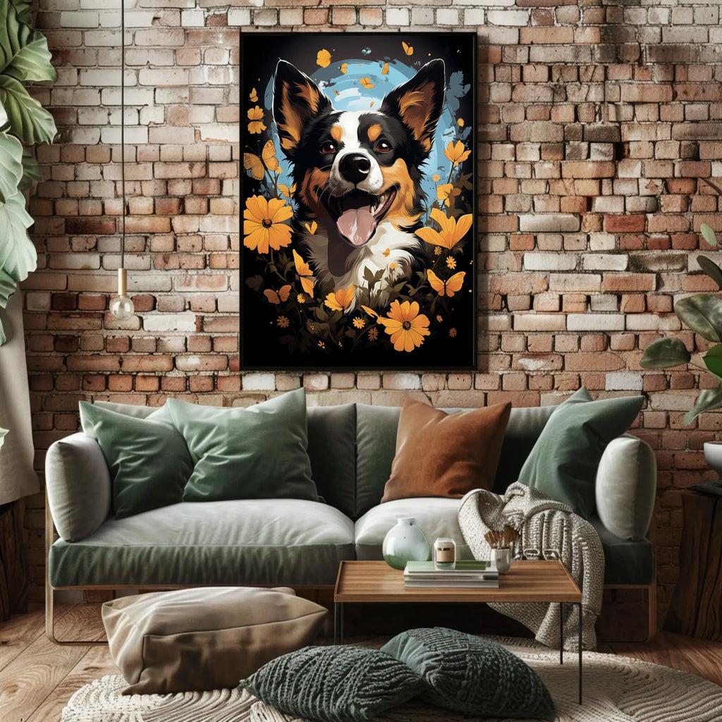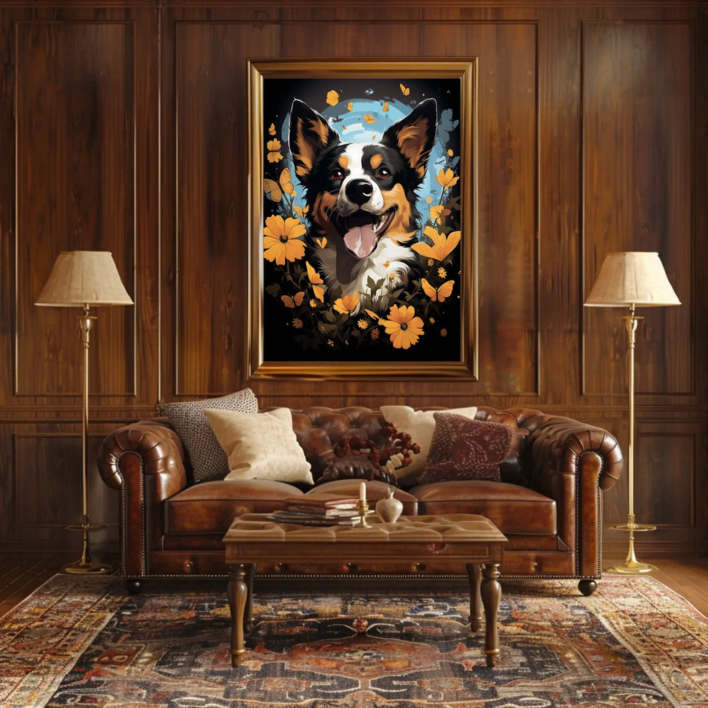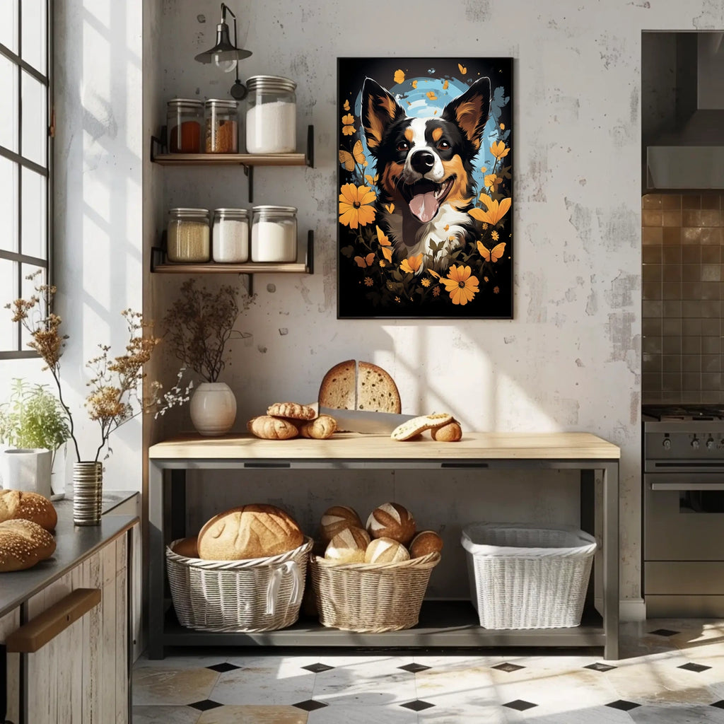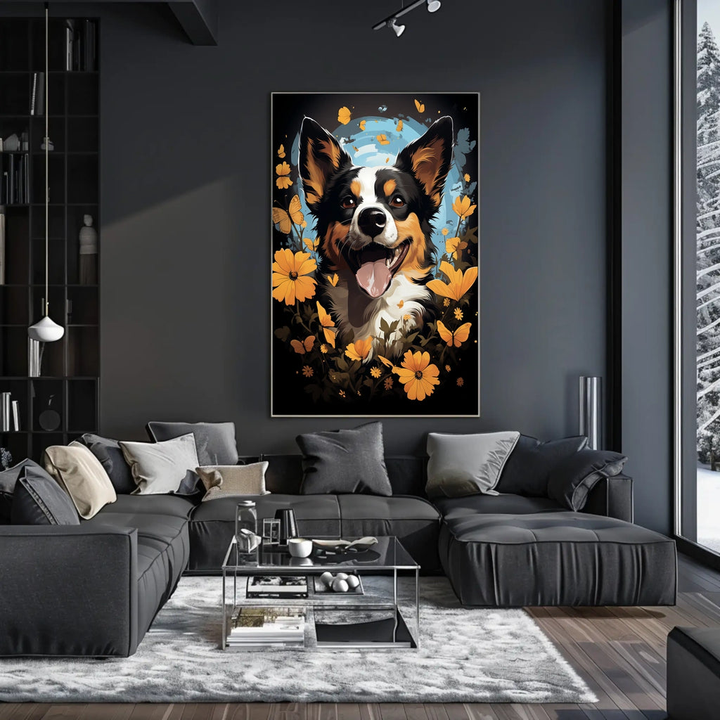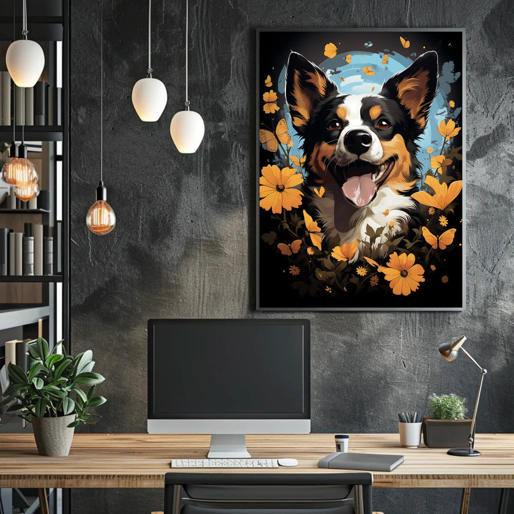 Joyful Dog and Flowers Nature Art Poster celebrates the beauty of nature and the exuberance of a playful canine. This vibrant wall art captures a lifelike dog surrounded by a lively display of yellow and orange flowers, with butterflies fluttering nearby to enhance the cheerful mood. The warm colors are set against abstract blue circular shapes that add depth, making this piece a striking centerpiece for any space.