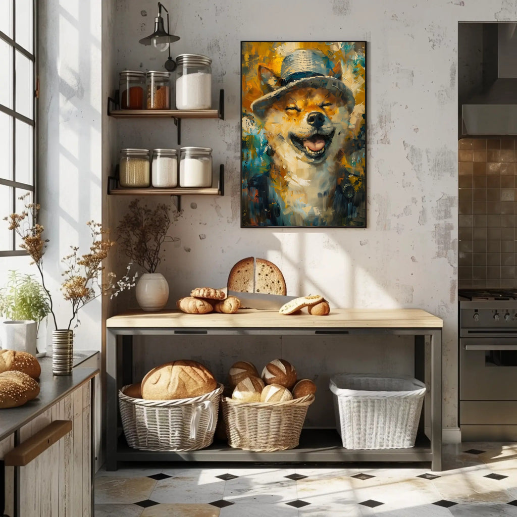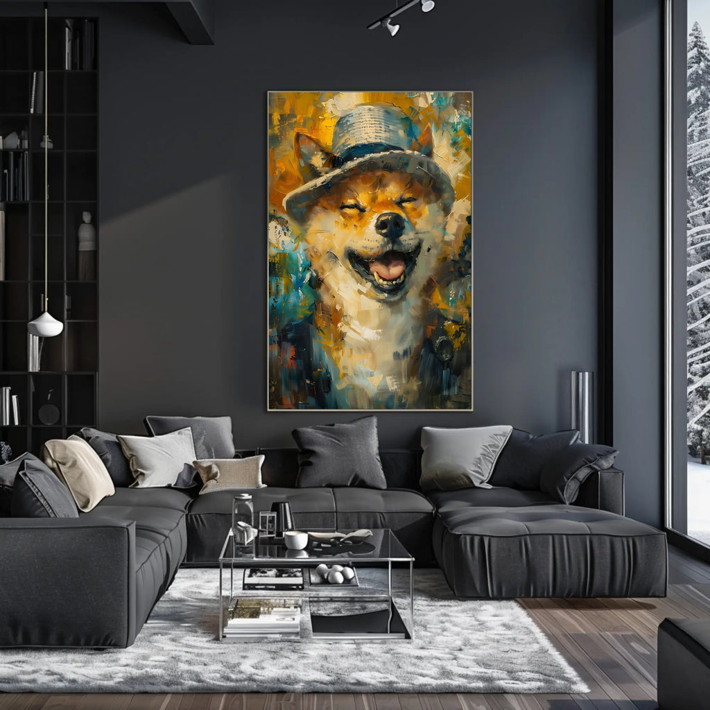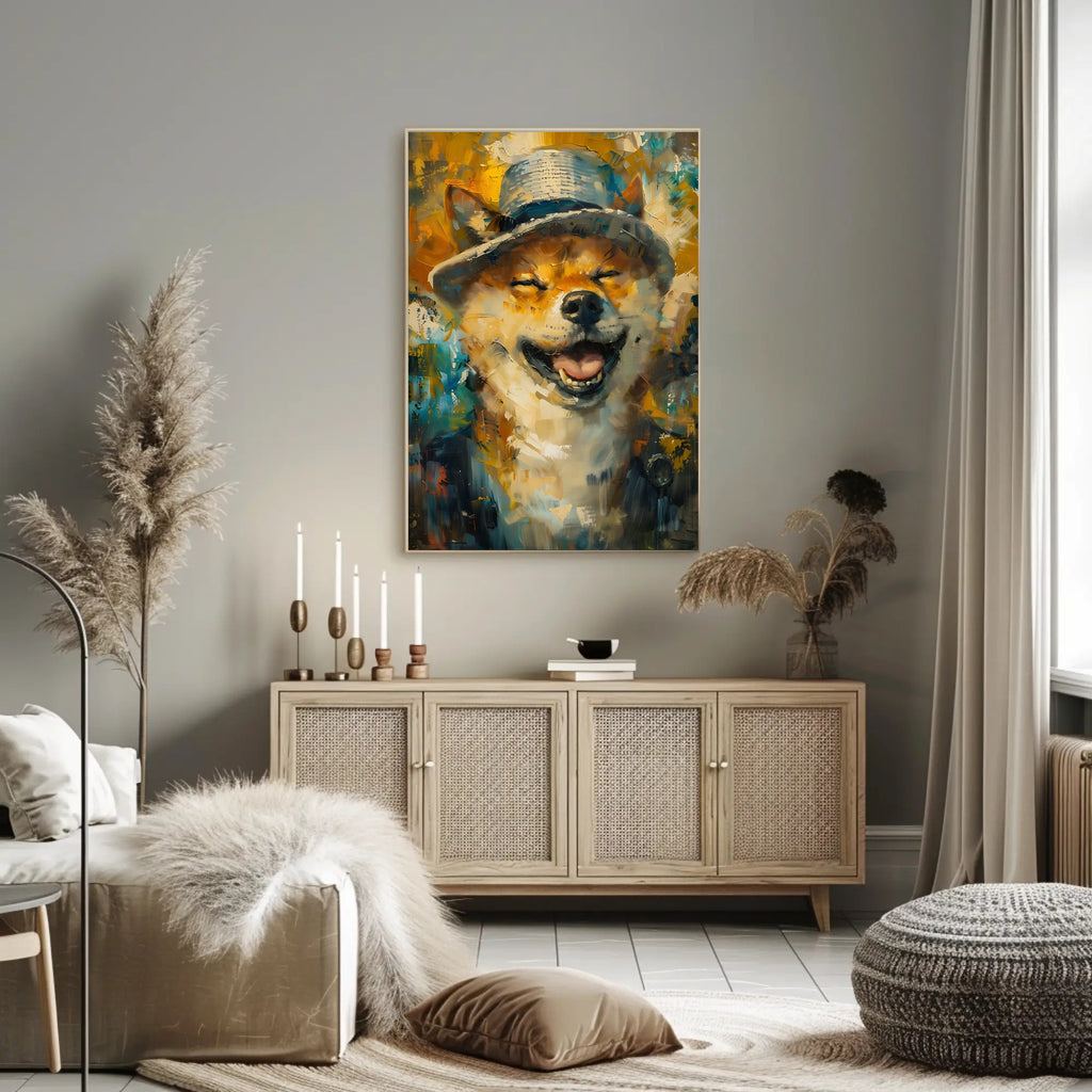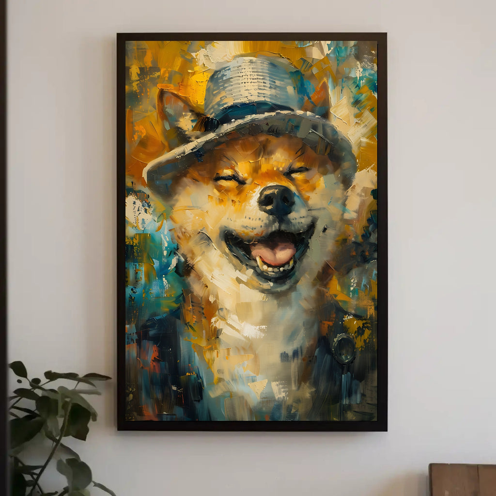 This expressive poster showcases an abstract painting of a joyful dog adorned with a stylish hat, embodying a whimsical and cheerful vibe. The dog, with its smiling expression and closed eyes, radiates happiness and relaxation. The impressionistic artistic style features bold, textured brushstrokes that bring the painting to life. The background is a vibrant mix of yellow, blue, and orange, blending harmoniously to create an energetic atmosphere. Perfect for art enthusiasts and dog lovers alike, this poster adds a playful touch to any room, celebrating the joy and carefree spirit of our furry friends.
