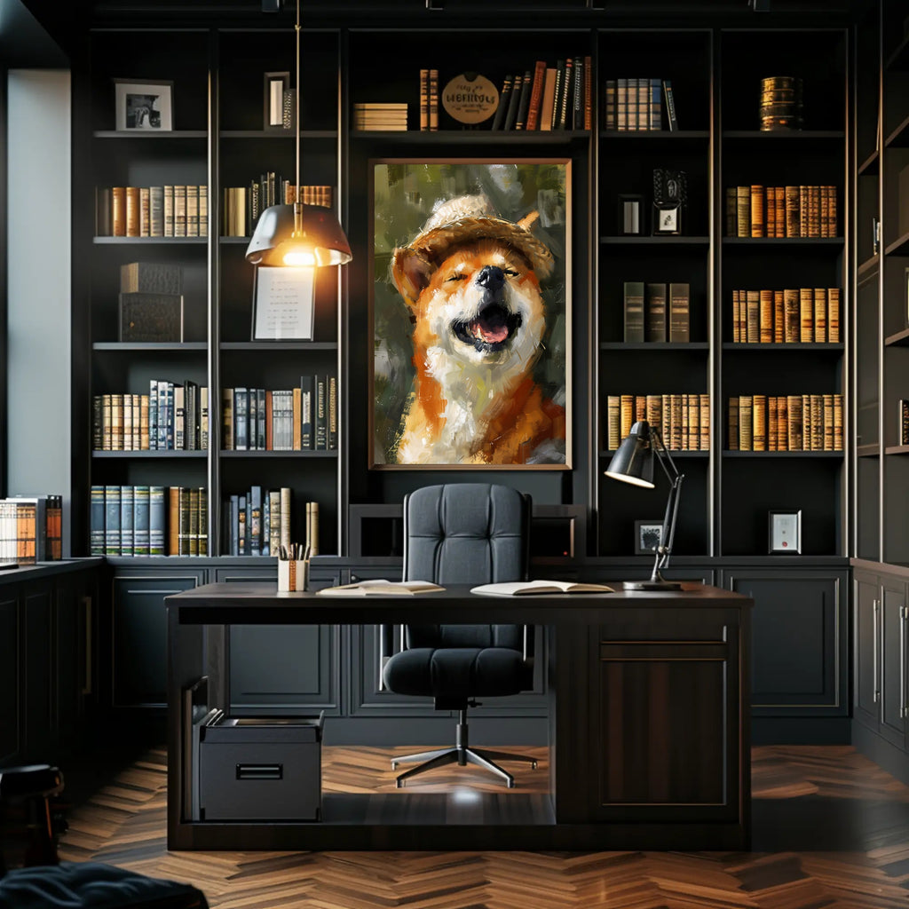 This vibrant and expressive poster captures the joyful essence of a dog delightfully adorned in a straw hat. The canine's lively grin and closed eyes exude a carefree, cheerful mood, masterfully conveyed through bold brushstrokes and vivid hues of orange, white, and brown. The background seamlessly blends blurred greens, suggesting a serene natural setting akin to a park or garden. Rendered in a modern impressionistic style, this artwork encapsulates a playful spirit, making it a delightful addition to any space seeking to showcase artistic flair and love for animals.