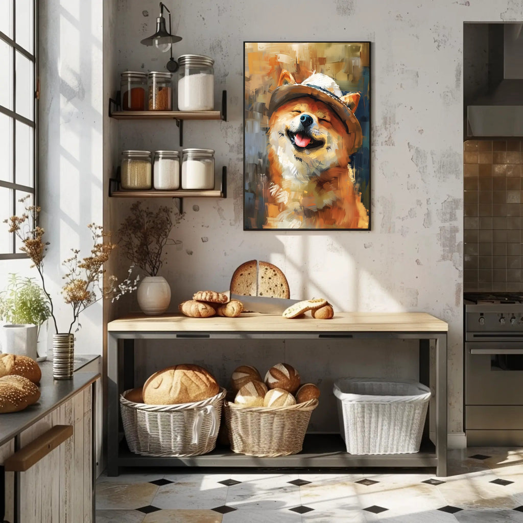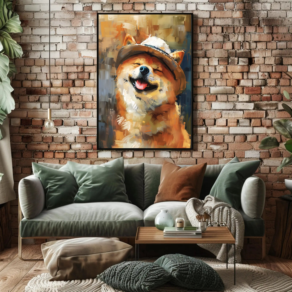 This delightful poster showcases a cheerful Shiba Inu dog, capturing its vibrant spirit through an impressionistic artistic style. The dog, with its tongue playfully out, wears a fashionable straw hat that adds a touch of whimsy and charm. The dynamic brush strokes and vivid colors bring a lively, textured appearance, creating a sense of movement and vitality. Ideal for dog lovers and art enthusiasts, this piece evokes joy and warmth, making it a perfect addition to any space that seeks to inspire positivity and happiness with its playful, artistic flair.