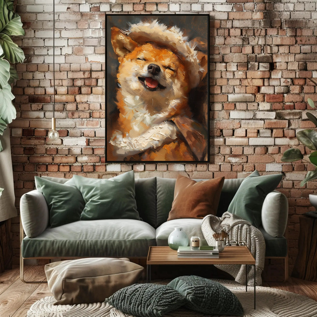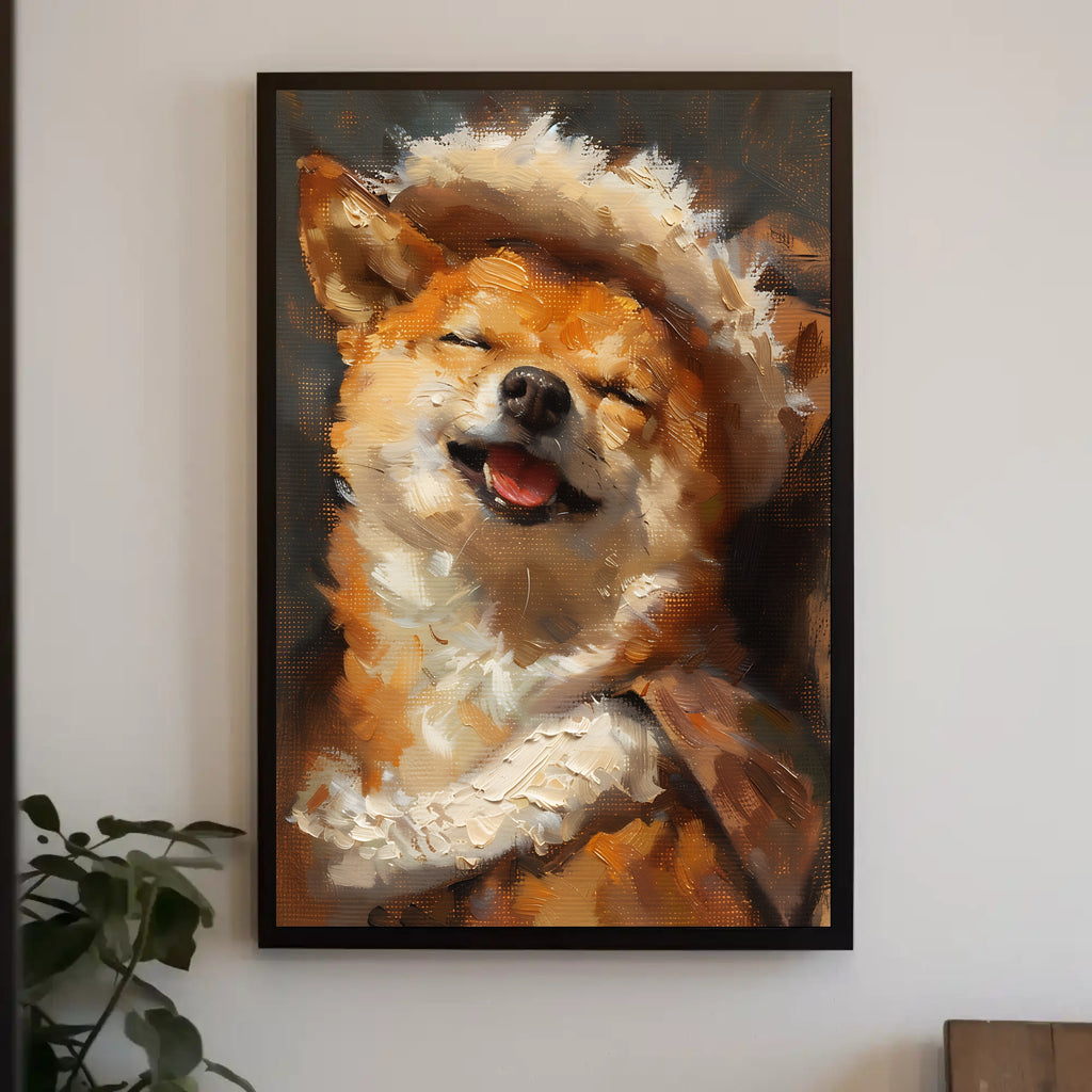 Brighten any room with this whimsical and charming poster featuring a cheerful Shiba Inu donning a playful hat. Captured in a textured, impressionistic style with visible brush strokes, this artwork evokes happiness and lightheartedness through its warm, rich color palette. The jubilant expression of the dog adds a delightful touch, making it an ideal choice for animal lovers and art enthusiasts alike. This unique piece not only showcases the beloved Shiba Inu breed but also serves as a testament to the artistic value of impressionistic paintings, creating an inviting and joyful atmosphere in any space.