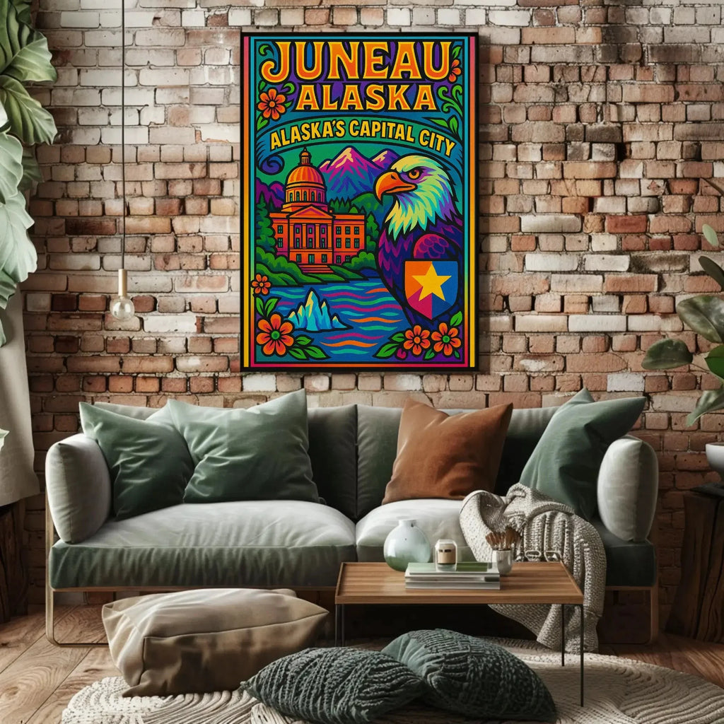 Juneau Alaska Bold Pop Art Travel Poster from PosterGoat brings the rugged beauty of Alaska into your space with a vibrant, modern twist. This 24" x 36" poster celebrates Juneau — Alaska’s capital — featuring a striking bald eagle, the state capitol building, jagged mountains, floating icebergs and decorative florals rendered in bold Pop Art colors and clean, graphic lines.