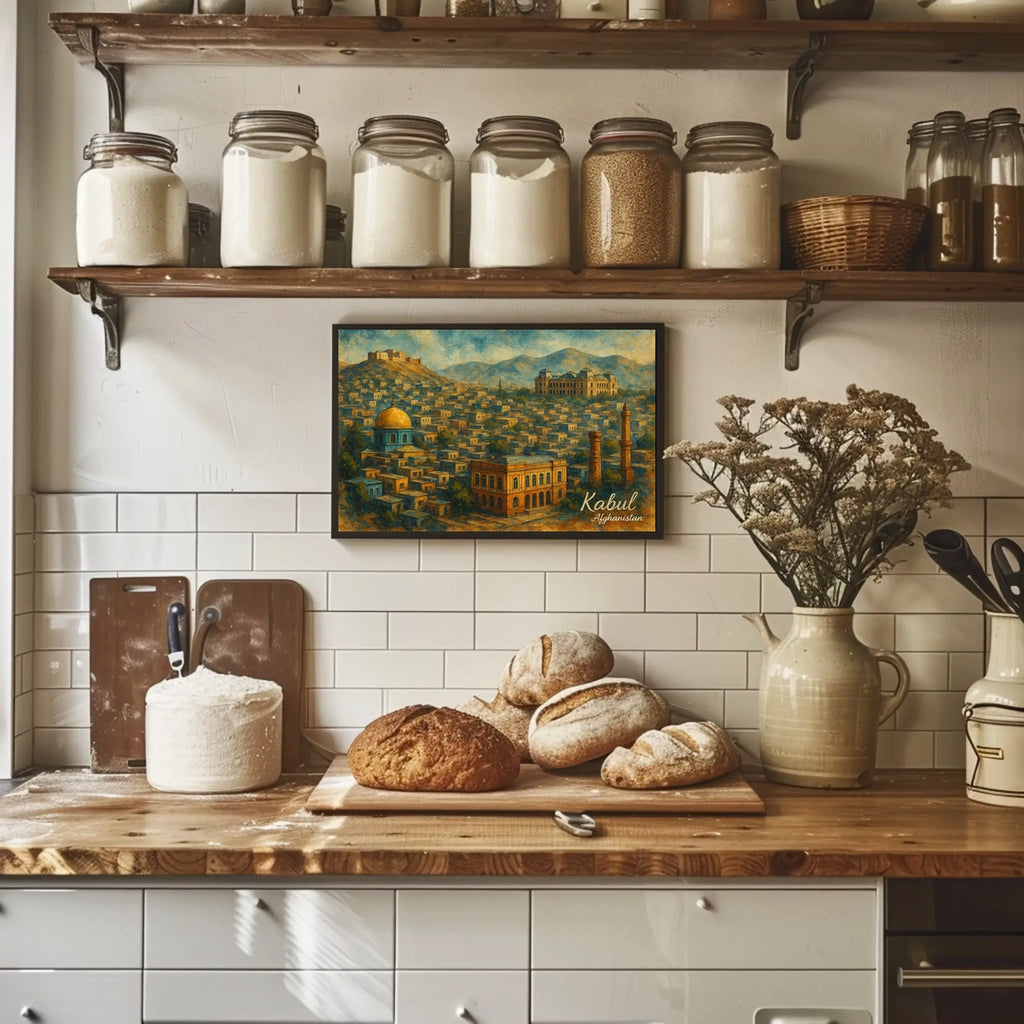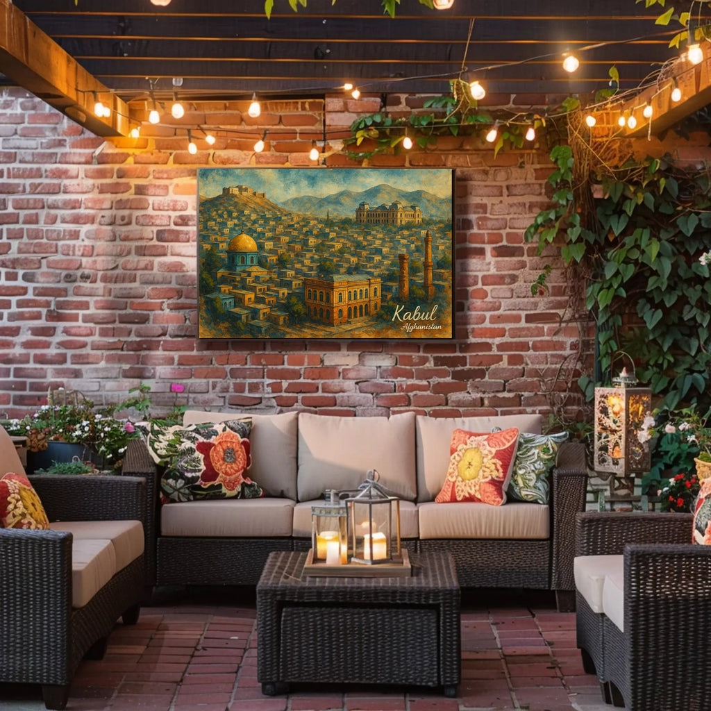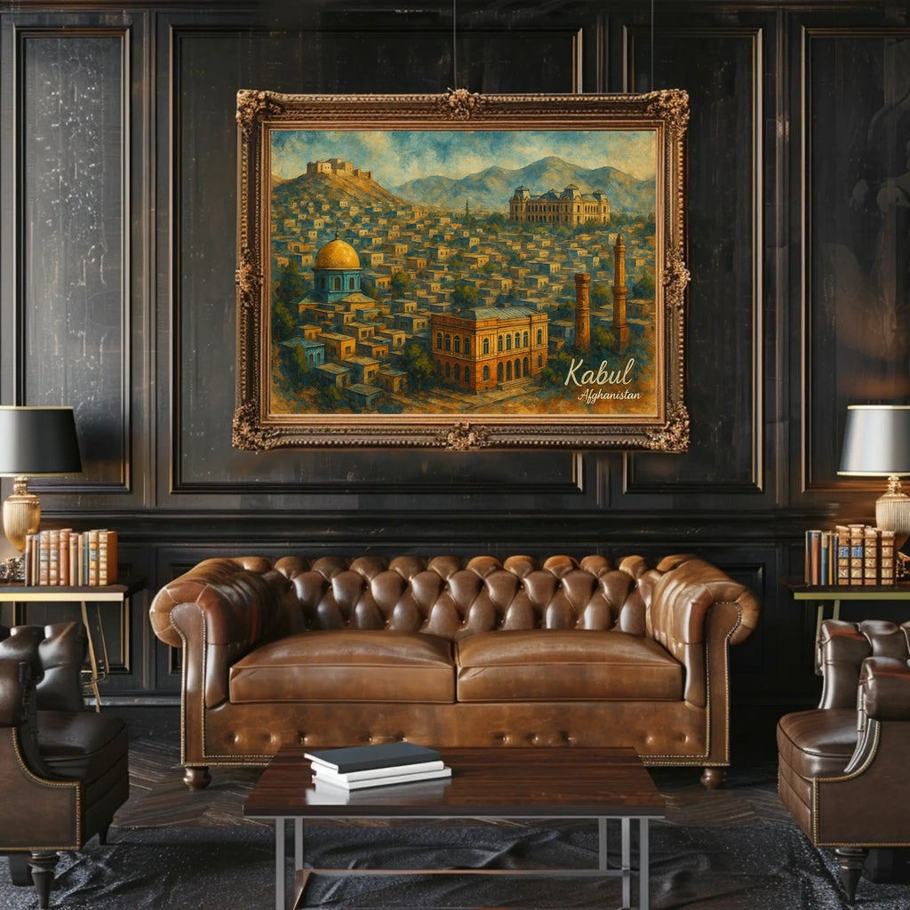 Detailed design highlighting iconic Kabul landmarks and the city's vibrant street life