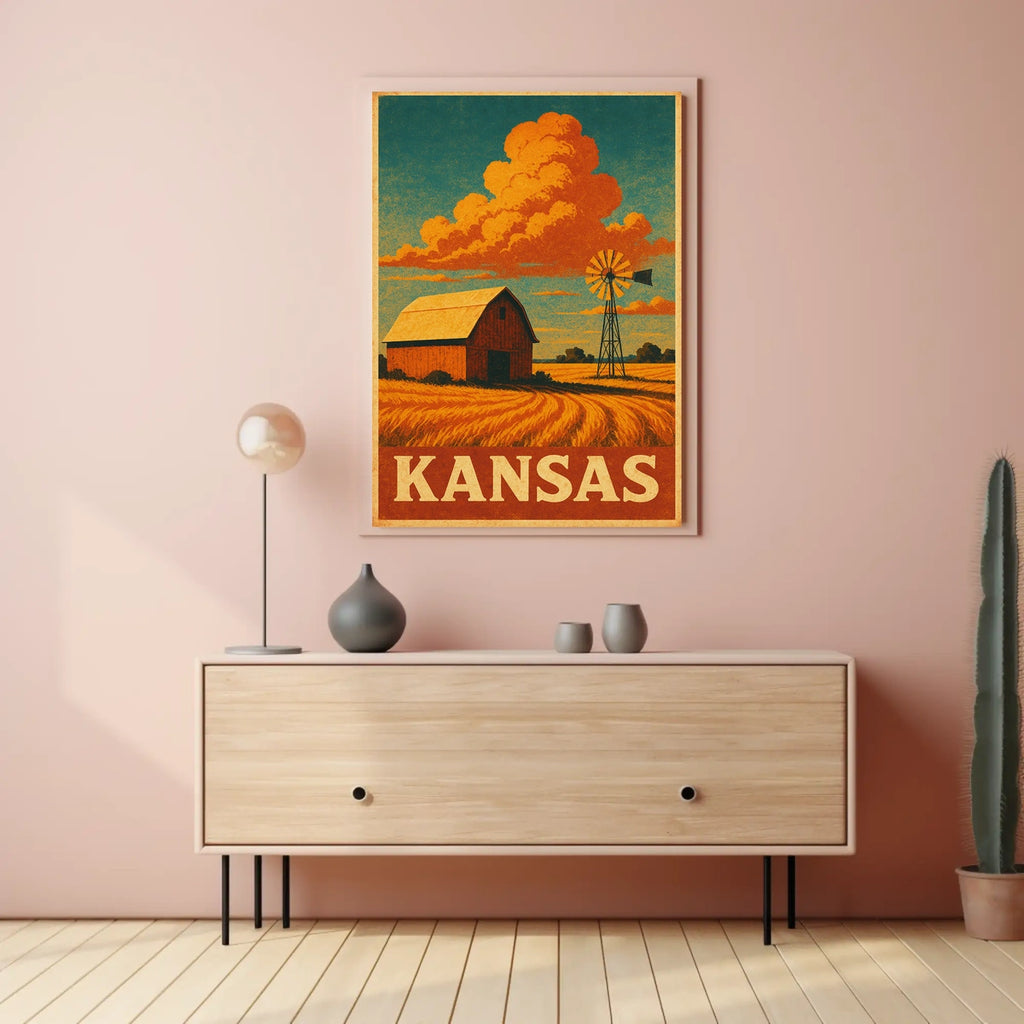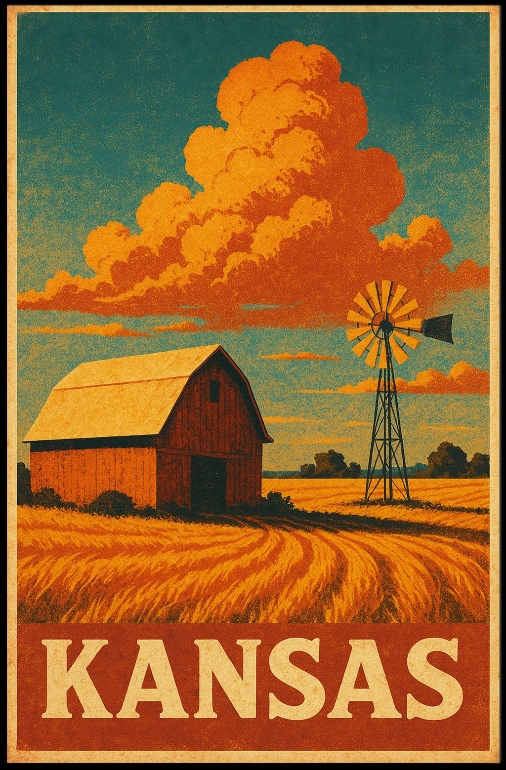 - Detailed design highlighting the rolling plains, open skies, and wheat-field textures that capture the unique angle of Kansas countryside