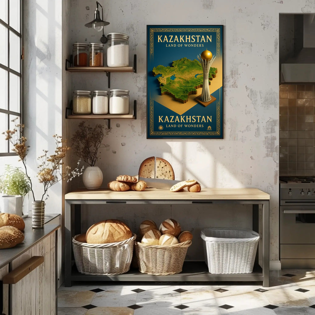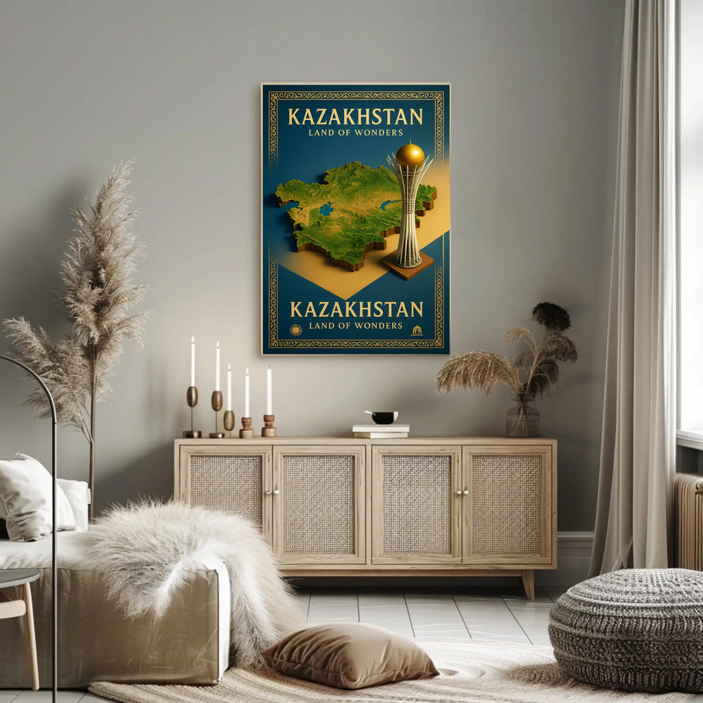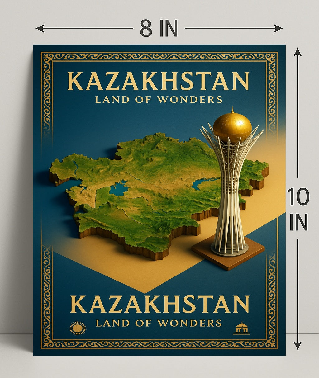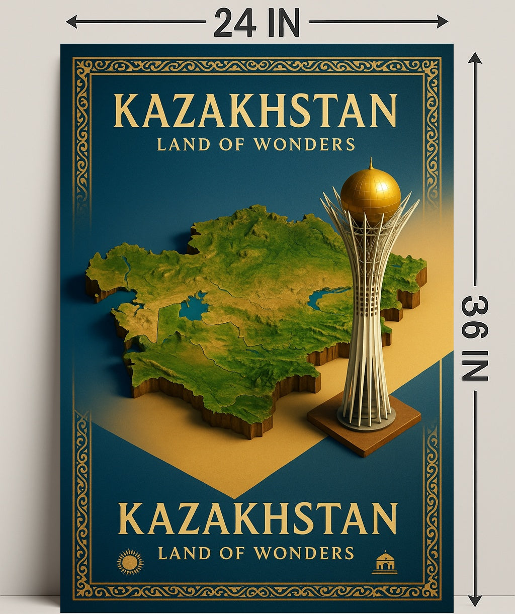 Kazakhstan Land of Wonders Poster from PosterGoat brings the majestic landscapes and iconic architecture of Kazakhstan into your home. This artful poster features a sculpted 3D map motif paired with a striking depiction of the Bayterek tower, framed by elegant gold filigree—an ideal focal point for living rooms, offices, or travel-inspired interiors.