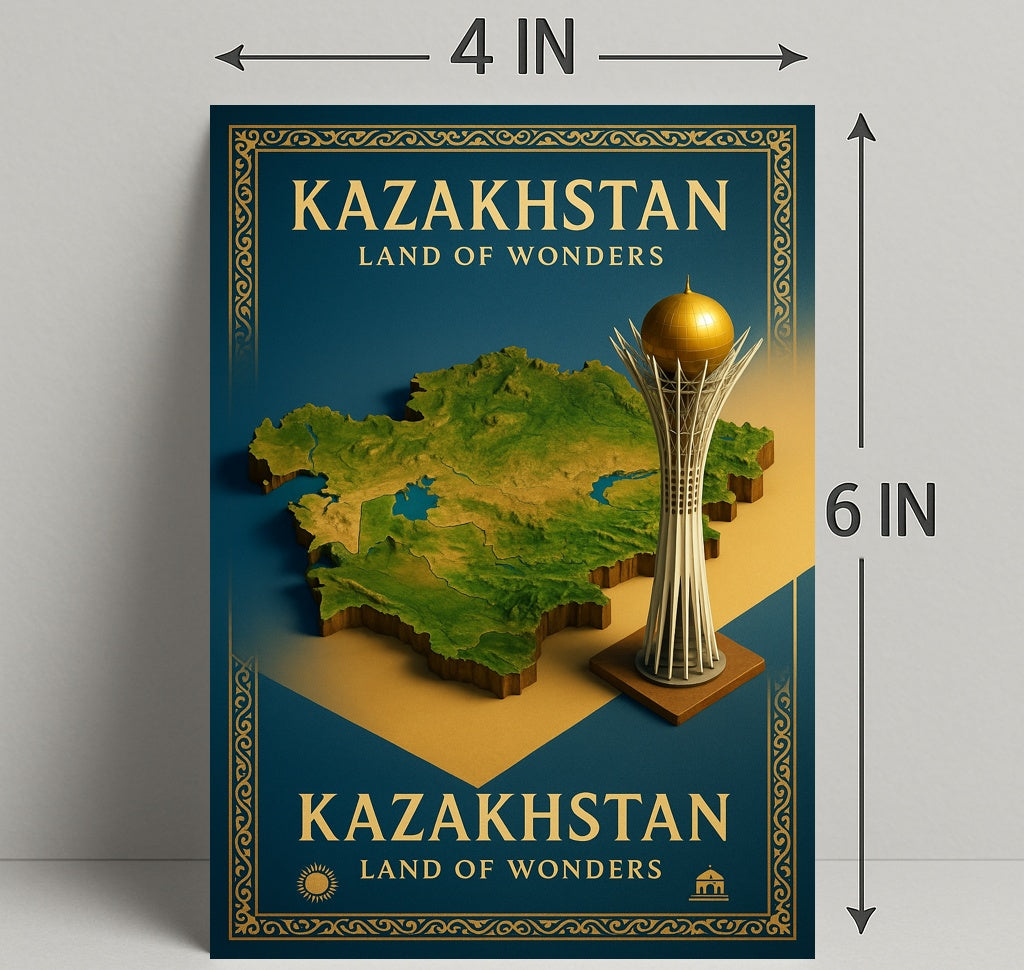Distinctive design: 3D topographic map and Bayterek landmark artwork celebrate Kazakhstan’s landscapes and culture in a refined, souvenir-style poster.
