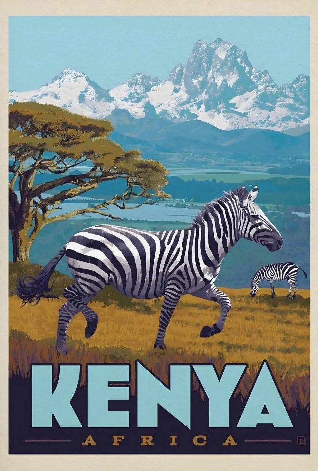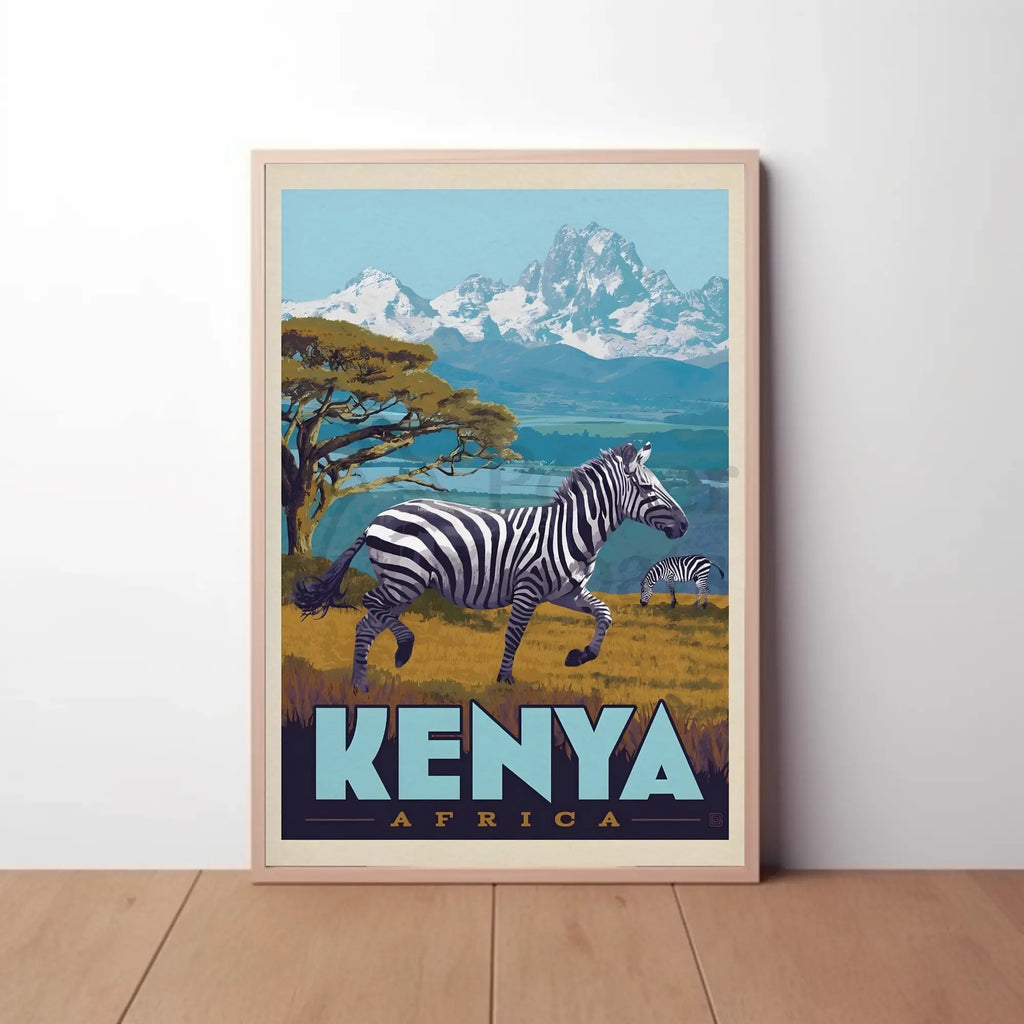 Transport any room to the wild heart of East Africa with the Kenyan Adventure Vintage Travel Scene Poster from PosterGoat. This striking poster pairs bold, clean lines and a vibrant, vintage-inspired color palette to showcase zebras grazing across the golden savannah with Mount Kenya’s snow-capped peaks rising in the distance — a timeless tribute to safari life and travel-inspired decor.