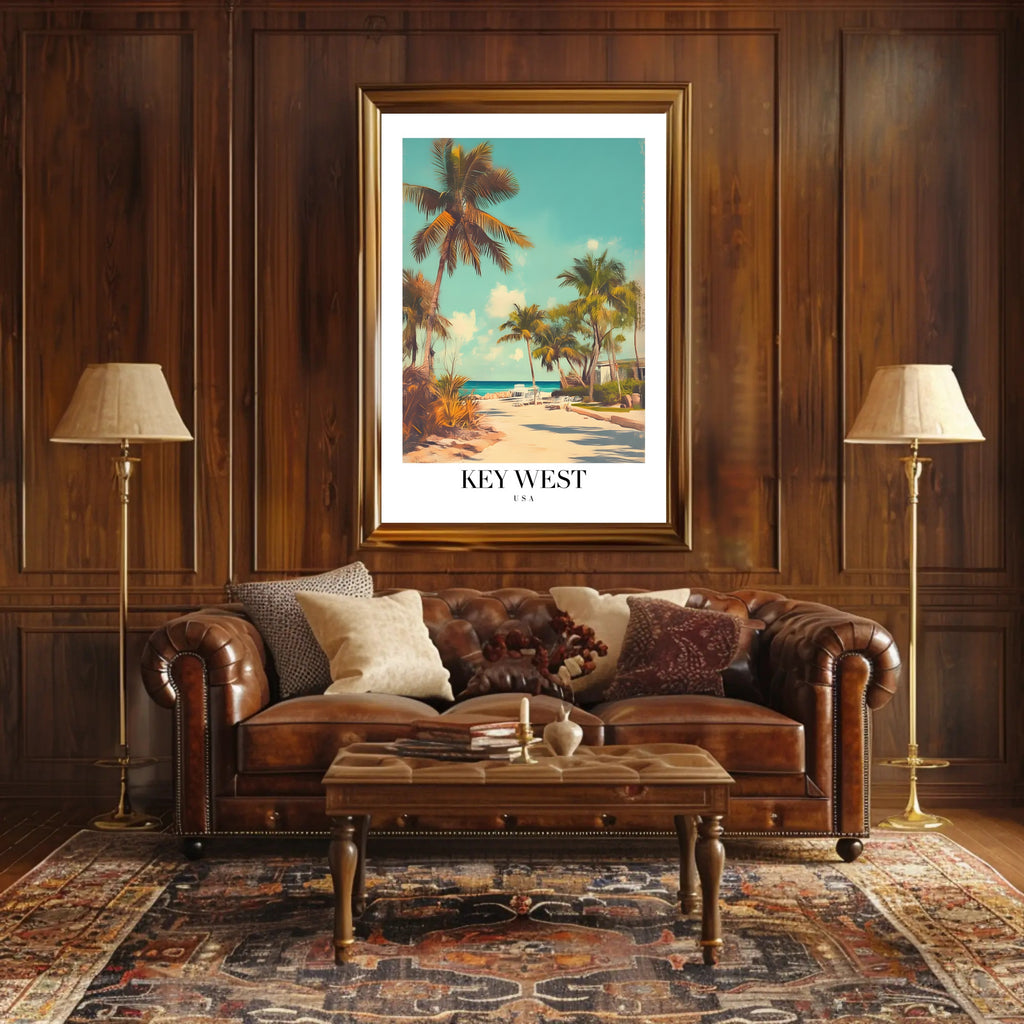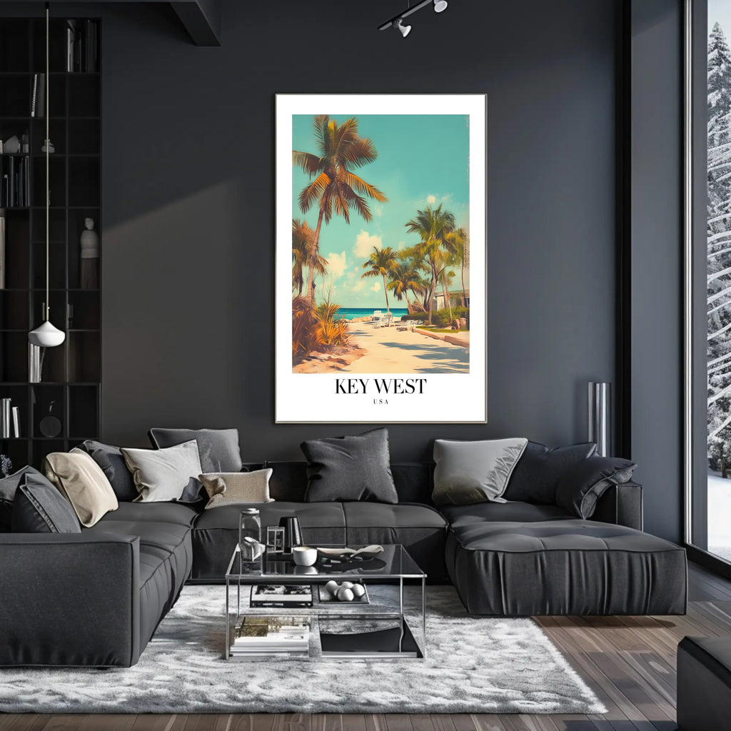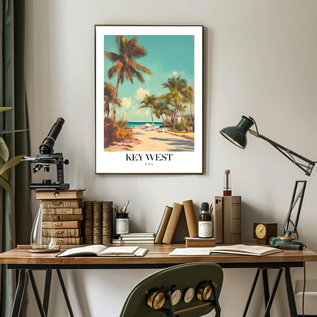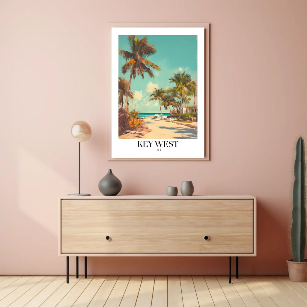 Experience the serene beauty of Key West with this poster, capturing the essence of a tropical island getaway. The image presents a tranquil beach scene adorned with tall palm trees and a sandy pathway leading to the inviting ocean. Lounge chairs dot the coastline, inviting the viewer to imagine a moment of relaxation. Its vintage aesthetic is achieved through soft colors and a stylized, slightly faded look, reminiscent of the classic travel posters from a bygone era. This piece embodies a peaceful mood, making it a perfect addition for those seeking a touch of serenity and nostalgia.