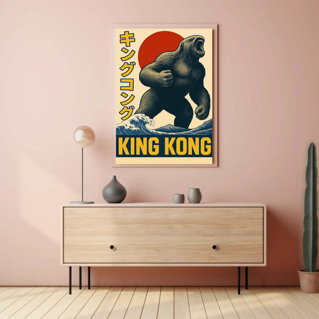Striking composition: Towering King Kong artwork with a dramatic red sun and stylized wave motif that reads perfectly from across the room.
