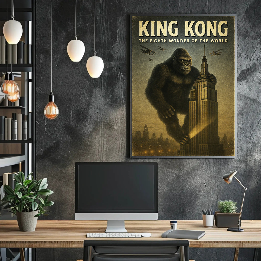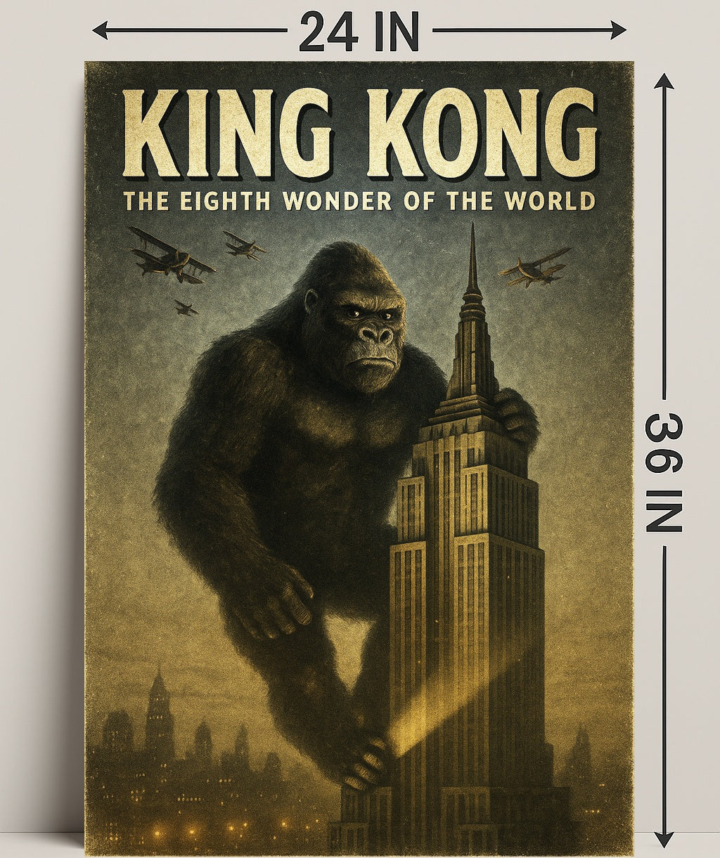 Bring cinematic drama and vintage pop-art style to your walls with the "King Kong — The Eighth Wonder of the World" poster from PosterGoat. This striking print recreates the iconic moment of King Kong towering over a classic skyscraper, rendered in warm sepia tones and rich textured shading for an authentic, retro look that commands attention in any room.