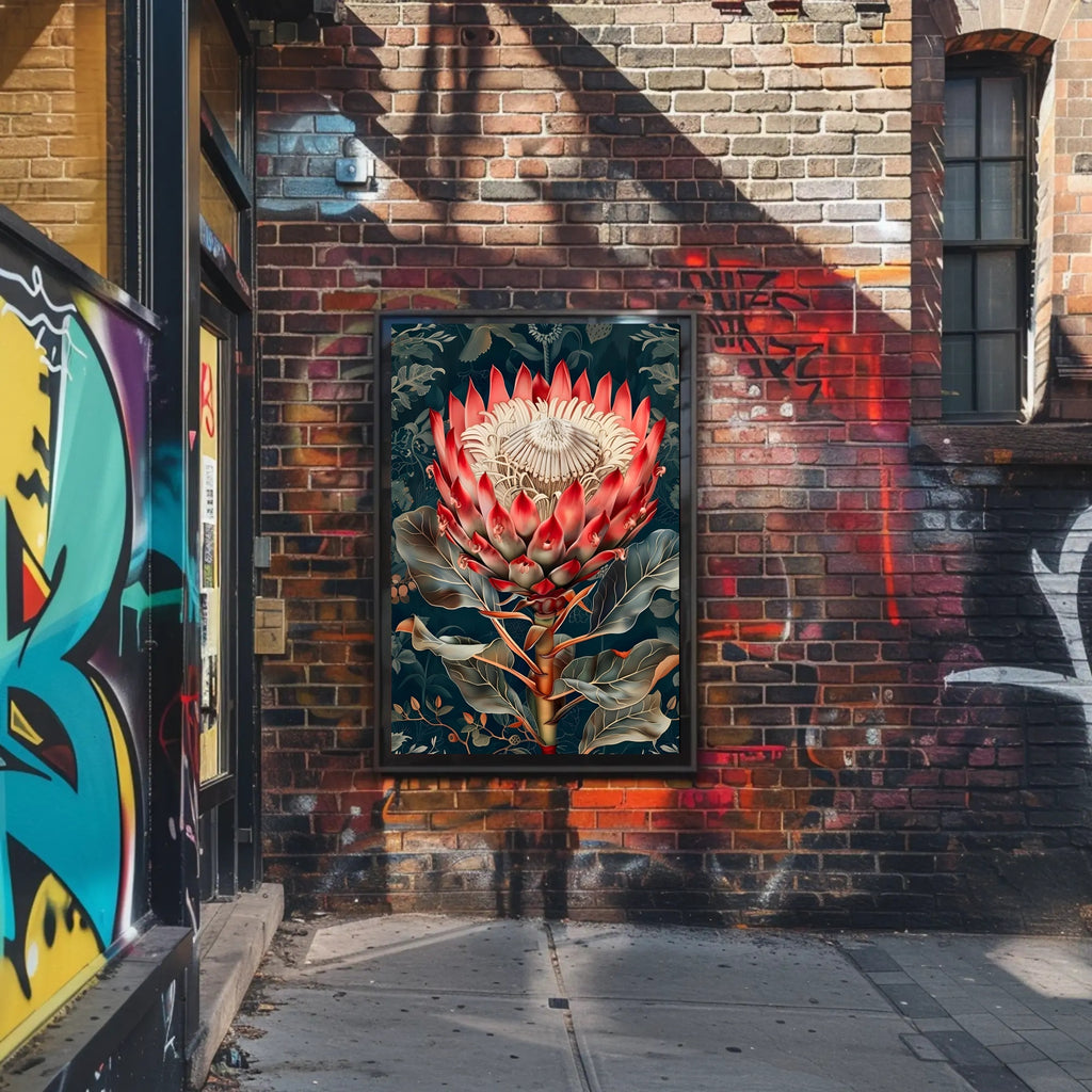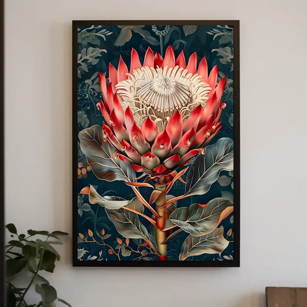 This eye-catching print pairs painterly realism with an artistic, vintage-collage backdrop: deep teal negative space frames the oversized protea bloom, while warm coral-red petals and delicate ivory center filigree create dramatic contrast. Intricate leaf veins, soft metallic accents and layered botanical sketches give the piece a gallery-quality depth that elevates modern and classic interiors alike.