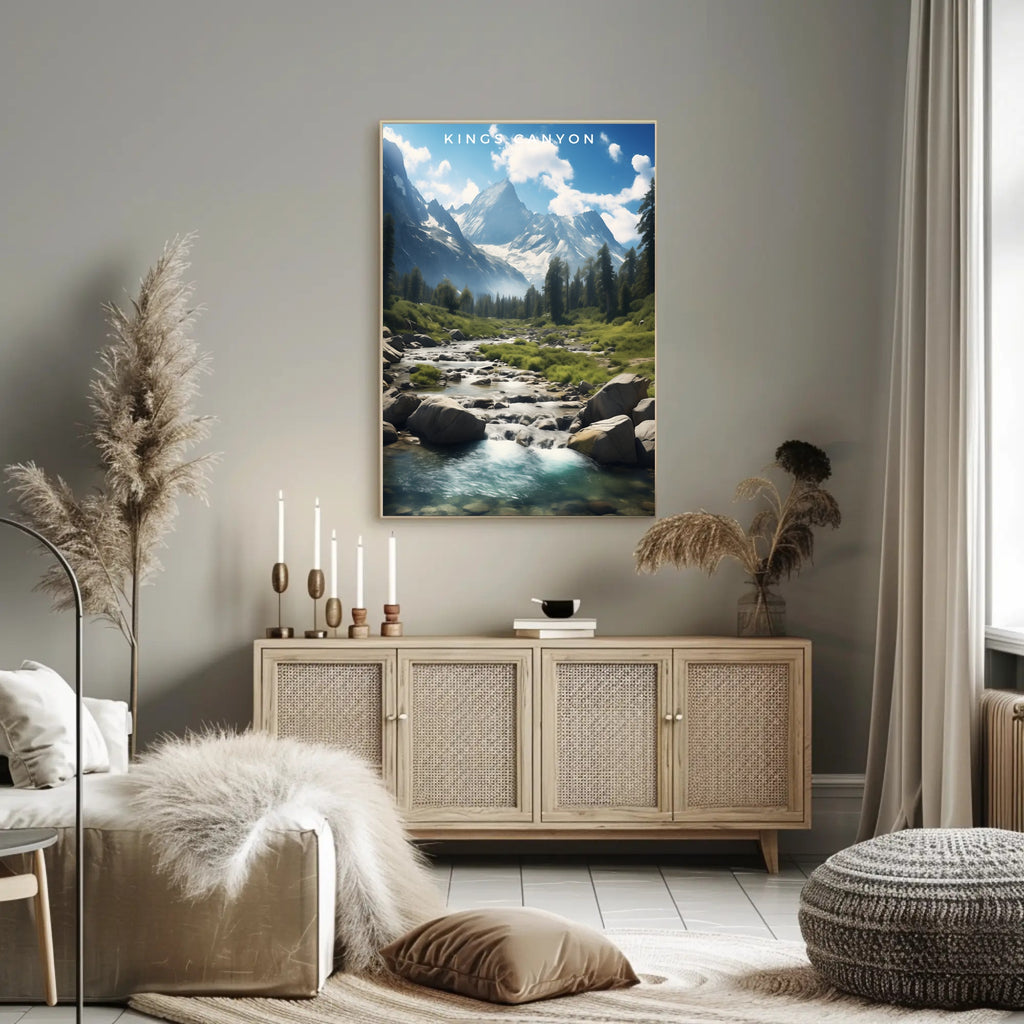 Bring the spirit of the Sierra into your home with this Kings Canyon National Park travel poster from PosterGoat. This minimalist, travel-inspired print features towering snow-capped peaks, a crystal-blue alpine stream cascading over smooth boulders, and sunlit meadows framed by stately pine trees — a serene landscape that invites wanderlust and calm.