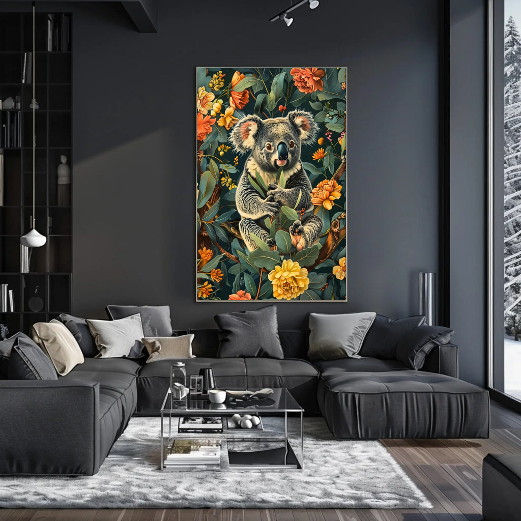 Rendered in rich jewel tones and meticulous detail, this print captures texture and depth: the koala's soft fur, expressive amber eyes, and the layered foliage and flowers that frame it create an intimate, gallery-ready scene perfect for living rooms, nurseries, or office spaces.