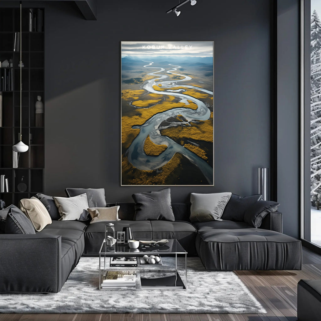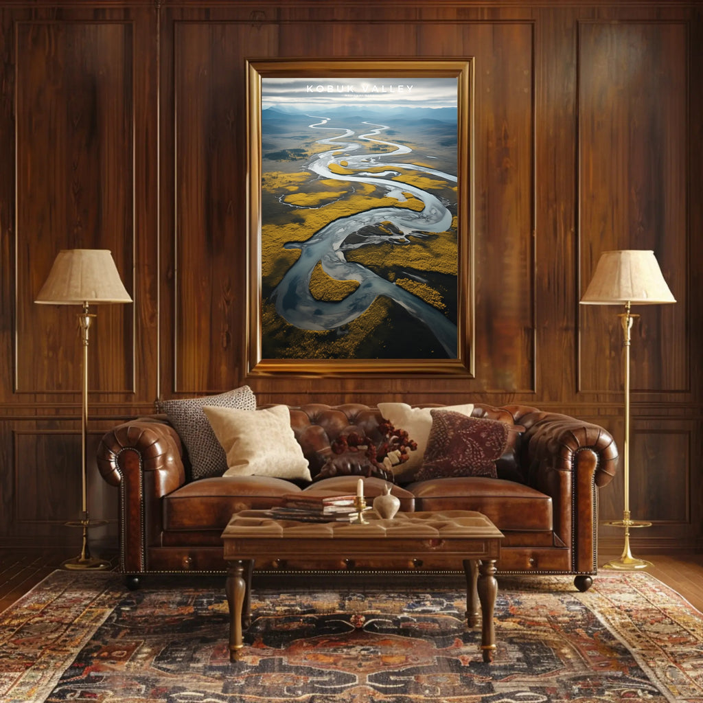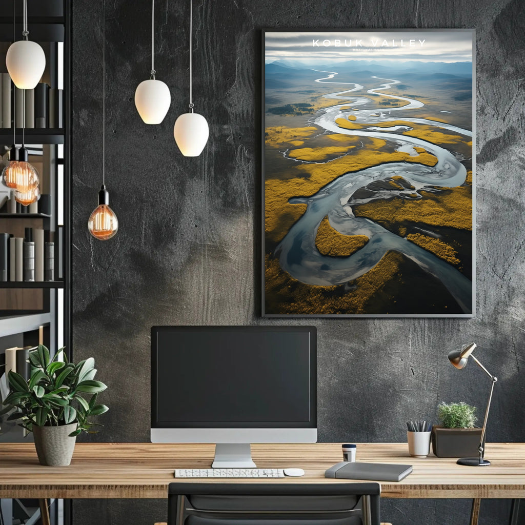 Capture the wild, sweeping beauty of Alaska with the Kobuk Valley National Park Travel Poster by PosterGoat. This minimalist, vintage-style print transforms an aerial photograph into striking travel art — a sinuous river weaving between golden river islands against soft, distant mountains. Perfect for adventure decor, nature lovers, and anyone who wants a bold focal point for living rooms, offices, or cabins.