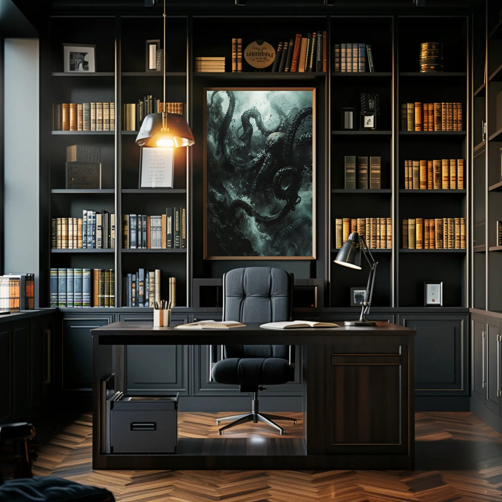 This poster brings mythological terror to life with high-contrast textures, deep teal and charcoal tones, and cinematic lighting that highlights every suction cup and spray of seawater. Perfect for living rooms, home offices, game rooms, or nautical-themed spaces that demand an intense, adventurous statement piece.