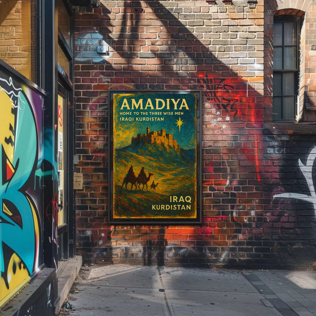 Bring home a piece of cultural heritage with this captivating Amadiya poster. Rich, painterly brushstrokes depict the ancient fortress of Amadiya under a luminous starry sky while a procession of three camel riders crosses the dunes below—an evocative scene that blends historical significance with dreamy, impressionistic texture. Perfect for art lovers, travelers, and anyone seeking heritage decor with striking visual impact.